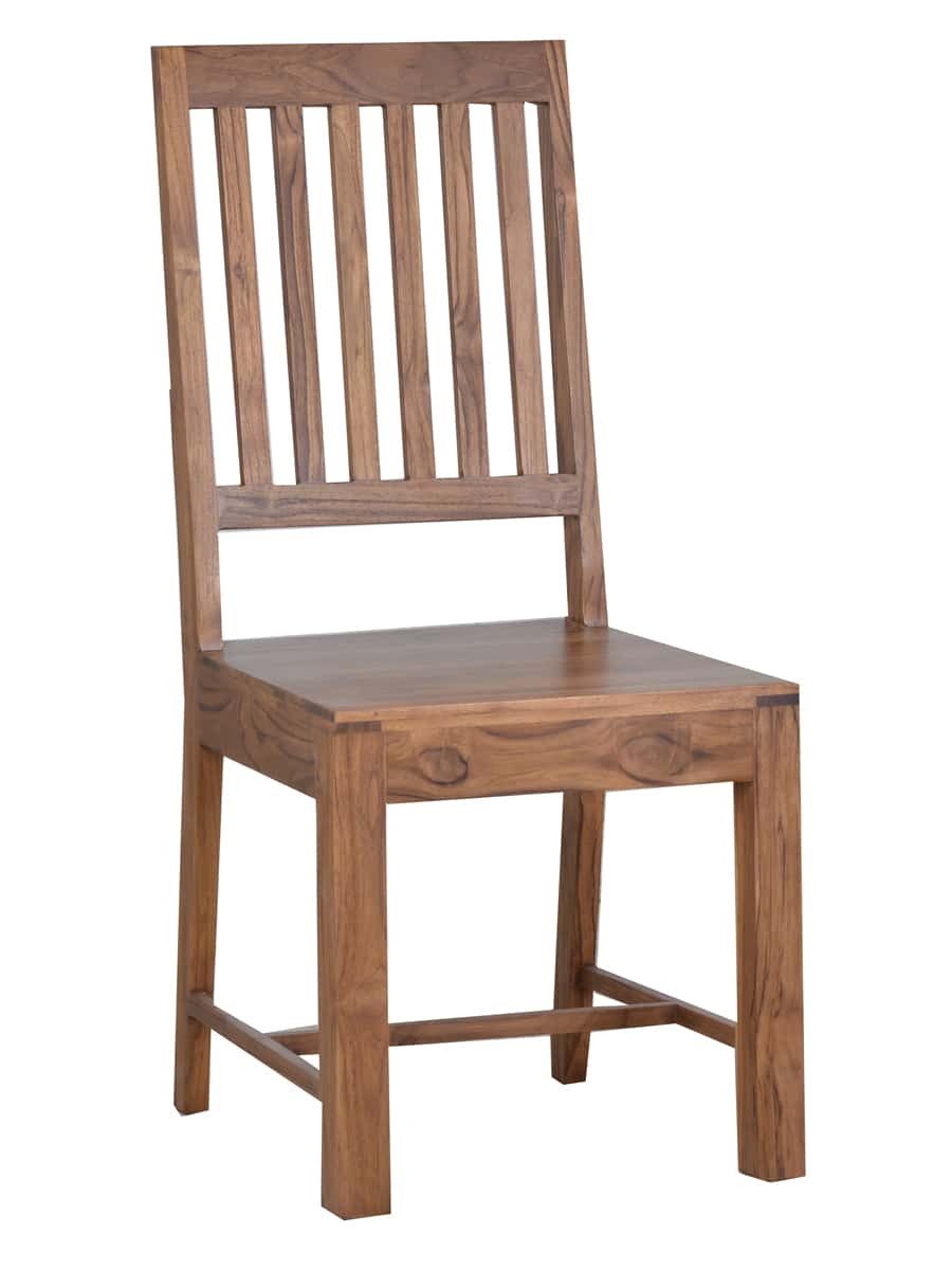 Dieser massive Holzstuhl aus Teak passt nicht nur zu allen Esstischen der Serie "Thali", sondern lässt sich natürlich auch mit allen anderen Esstischen kombinieren. Denn farblich harmoniert dieser schlichte und zeitlose Esszimmerstuhl mit allen unseren natur gebeizten Teakholz-Möbeln. Die Rückenlehne des Stuhls besitzt eine leichte Neigung, die für angenehmes Sitzen sorgt. Der Lamellenstil der Rückenlehne lockert die sonst sehr massive Bauweise des Stuhls auf und lässt ihn leichter wirken. Das Stuhlgestell besteht aus vier stabilen Beinen, die zusätzlich mit drei Querstreben stabilisiert wurden. Dadurch ist ein stabiler Stand des Stuhls gewährleistet. Wer etwas weicher sitzen möchte, kann den Stuhl durch eine Sitzauflage ergänzen. Ein passendes Sitzkissen finden Sie unter der Артикул: 50101 in unserem Shop. Dieser Stuhl wurde in Indien mit Holz aus zertifiziertem und kontrolliertem Anbau gefertigt. Auf industrielle Hilfsmittel wurde dabei bewusst und weitgehend verzichtet. Daher handelt es sich bei diesem Möbelstück um ein echtes Handwerksstück und keine Massenware. Leichte Abweichungen der Maße, der Farbe sowie mögliche Unebenheiten sind Zeuge dieser Herstellungsweise und keine Makel.