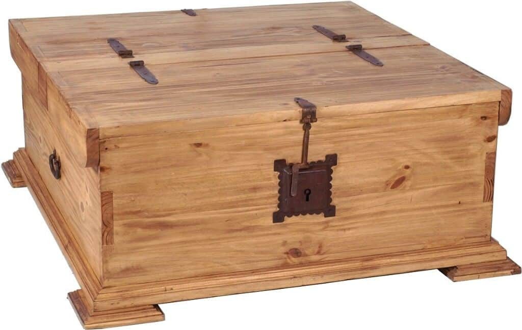 Praktischer Truhentisch im Landhausstil. Mit diesem Couchtisch aus Massivholz sorgen Sie für stilvollen Stauraum und Abstellfläche. Diese quadratische Landhaustruhe wurde aus massivem Pinienholz gefertigt und mit Antikwachs behandelt. Die gewachste Oberfläche schützt das Holz zuverlässig vor starken äußeren Einflüssen und verleiht dem Holz seine charakteristische honigbraune Farbe. Auffällig sind bei diesem Möbelstück die handgearbeiteten Beschläge und Griffe. Um den rustikalen Charakter des Möbelstücks zu unterstreichen, wurden diese mit einer künstlichen Rostpatina versehen. Das dekorative Bügelschloss ziert ebenfalls ein Beschlag in typisch mexikanischem Stil. Das sonst sehr schlicht gehaltene Kastenmöbel wurde auf vier quadratische profilierte Beine gestellt. Dies gibt der Truhe etwas Leichtigkeit und betont die Funktion als Couchtisch. Der Deckel der Truhe ist in zwei Teile aufgeteilt und lässt sich von beiden Seiten öffnen. So müssen Sie den Truhentisch beim Öffnen nicht komplett abräumen. Im Inneren der Truhe findet sich ausreichend Platz für Decken, Kissen oder Knabbereien. Auch Ihre Foto- oder Plattensammlung könnte hier verstaut werden. Der Truhentisch wurde in Mexiko überwiegend auf traditionelle Weise und von Hand gefertigt. Dies spiegelt den rustikalen Charakter des mexikanischen Landhausstils wider und macht dieses Möbelstück zu etwas ganz Besonderem. Kombinieren lässt sich die Truhe mit klassischen Landhausmöbeln, Wohnräumen im Ethnolook oder Bohostil sowie als Blickfang in einer modernen Einrichtung. Ihrer Fantasie sind keine Grenzen gesetzt.