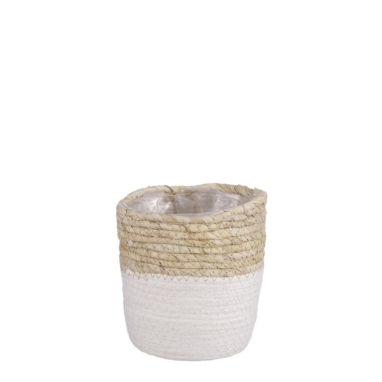 Dieser Rachel-Korb aus der Mica Decorations-Kollektion ist funktional und verleiht Ihrem Interieur gleichzeitig eine natürliche Note. Der Korb besteht aus Seegras und ist sehr umweltfreundlich. Diese natürliche Basis ist im oberen Teil des Korbs deutlich sichtbar, während die untere Schicht eine frische, weiße Farbe hat. Die Plastikfolie macht den Korb sehr gut für eine schöne Pflanze geeignet, aber Sie können auch einige Dinge darin aufbewahren. Die Rachel-Körbe sind in verschiedenen Farben und Größen erhältlich. Dieser Korb ist weiß und hat eine Размер von H14 x Ø14 cm
