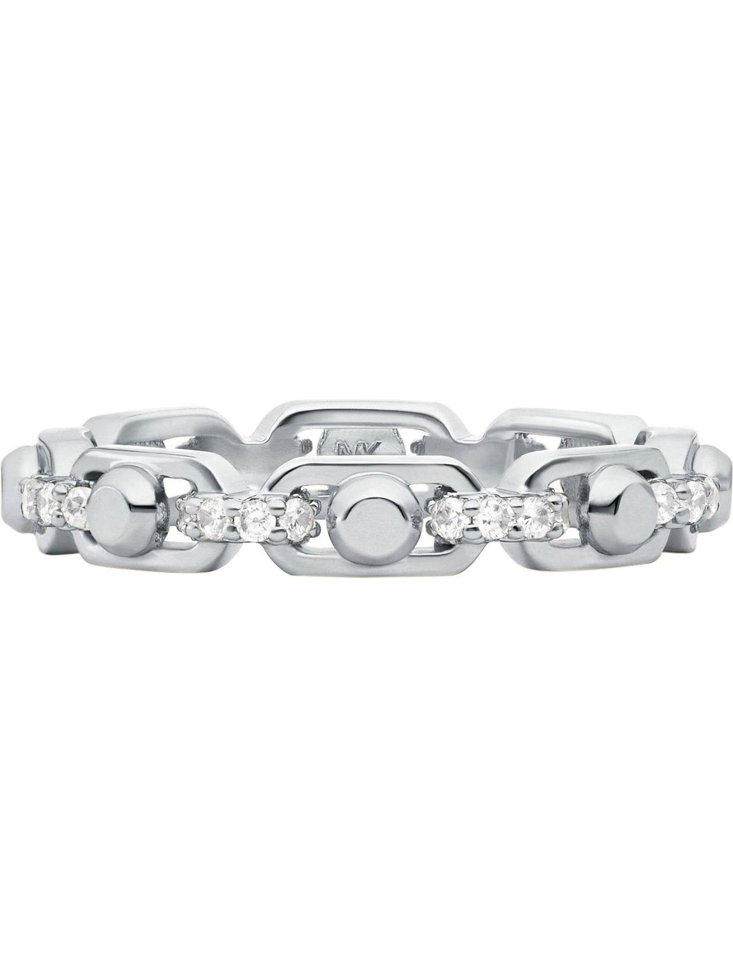 Feiner 925er Silber-Damenring aus der Michael Kors MICHAEL KORS ASTOR LINK-Kollektion, auf dem der Besatz mit Zirkonia begeistert. Die Edelsteinfarbe des Zirkonia ist ein klares, strahlendes Weiß. Als neutraler Farbton passt der Ring so zu einer Vielzahl an Outfits und Looks, dennoch ist das Glitzern und Funkeln ein Blickfang. Für einen edlen, silberweißen Schimmer und eine pflegeleichte, abriebfeste Oberflächenveredelung sorgt eine haltbare Rhodinierung, das Finish ist poliert. Ein Must-Have für Trendsetterinnen, die sich durch einzigartigen Stil abheben wollen – modisch, modern und vielseitig.
