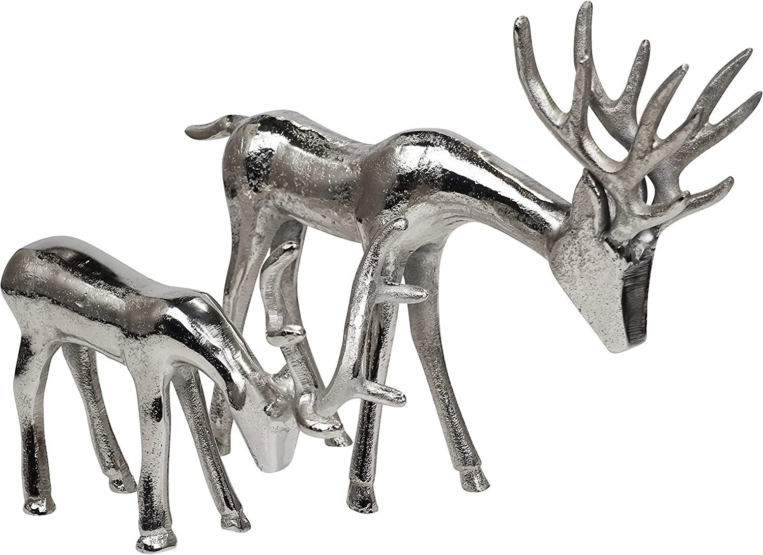 Diese wunderschönen Hirsch-Dekofiguren sind aus schwerem und hochwertigem Aluminium gefertigt. Die Hirsche wurden sehr detailreich und aufwendig verziert. Beide Hirsche beeindrucken mit ihrer eleganten Erscheinung. Die silberfarbenen Hirsche im 2er Set sind handgefertigt und somit kleine Unikate. Gerade die Farbe Silber lässt sich nahezu in jeden Einrichtungsstil integrieren. Außerdem versprüht die Farbe Silber auch immer einen Hauch von Luxus und Eleganz. Eine hochwertige und langlebige Dekoration für die gemütlichen Weihnachtstage. Natürliche eignen sich die Hirsche auch zur ganzjährigen Dekoration in deinem Zuhause. Ob auf der Festtafel, auf der Kommode, oder auf der Fensterbank dekoriert, die 2 Hirsche sind garantiert ein Blickfang.