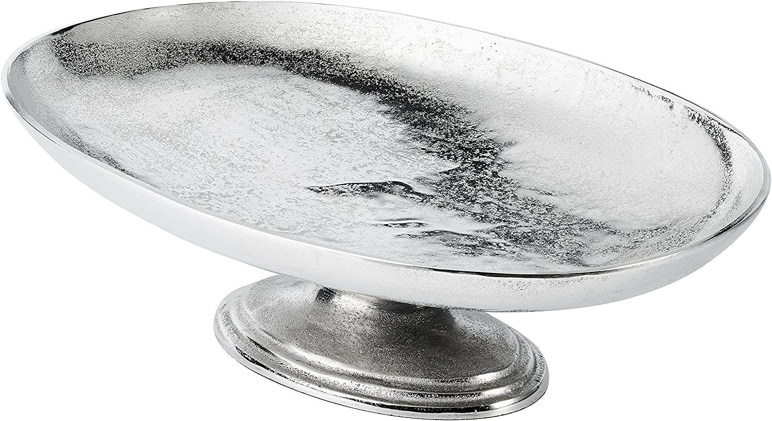 Wunderschöne Schale auf Standfuß in zwei verschiedenen Größen aus silberfarbenen Aluminium. Gerade die Farbe Silber lässt sich wunderbar in jeden Wohnstil integrieren. Außerdem versprüht die Farbe Silber auch immer einen Hauch von Luxus und Eleganz. Die Schale besitzt eine "Raw"-Oberfläche. Das bedeutet, dass die Schale nach dem Guß nicht mehr poliert wurde. Die Schale hat somit eine schöne Oberflächenstruktur und sieht wesentlich lebendiger aus. Die XL Schale in zwei verschiedenen Größen lässt sich wunderbar dekorieren. Ob mit Kerzen dekoriert, mit Windlichtern bestückt, oder aber ganz ohne Dekoration, ist die Schale garantiert ein Hingucker. Sollte das Produkt für Lebensmittel genutzt werden, muss immer eine Serviette oder ein Tortendeckchen darunter liegen. Unter der Schale befindet sich ein Kratzschutz. Die Deko-Schalen sind zu 100 % handgefertigt und somit Unikate. Leichte Unregelmäßigkeiten können auftreten und sind sogar gewollt. Lieferung erfolgt exklusive Dekoration.
