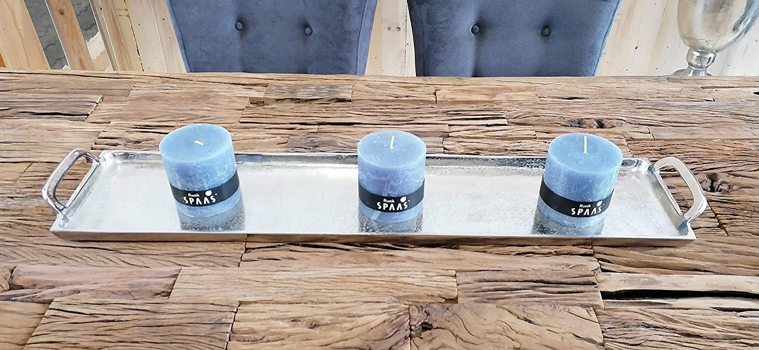 Tablett aus Aluminium von Michael Noll. Das XXL Tablett in der Farbe Silber besitzt seitlich Griffe, somit kann das Tablett auch voll bestückt sicher transportiert werden. Natürlich eignet sich das Tablett auch bestens zur Tischdekoration, bestückt mit Kerzen oder kleinen Windlichtern. Gerade auf einem großen Esstisch kommt das Tablett perfekt zur Geltung. Das Tablett wirkt sehr luxuriös und ist ein absolutes Deko-Highlight. Die Применитьung des Tabletts ist zu 100 % von Hand erfolgt und wurde mit viel Leidenschaft ausgeführt. Das Deko-Tablett ist in einer Raw-Optik gehalten, daher wirkt es sehr luxuriös. Dieses Tablett ist das perfekte Wohnaccessoire und lässt sich wunderbar in dein gemütliches Zuhause integrieren. Natürlich ist das Tablett auch perfekt für die Gastronomie, ein Restaurant, oder eine Bar geeignet. Außerdem ist das Tablett sehr pflegeleicht und muss nur ab und zu mal mit einem trockenen Tuch, oder einem leicht angefeuchtetem Lappen gesäubert werden. Lieferung erfolgt exklusive Dekoration.
