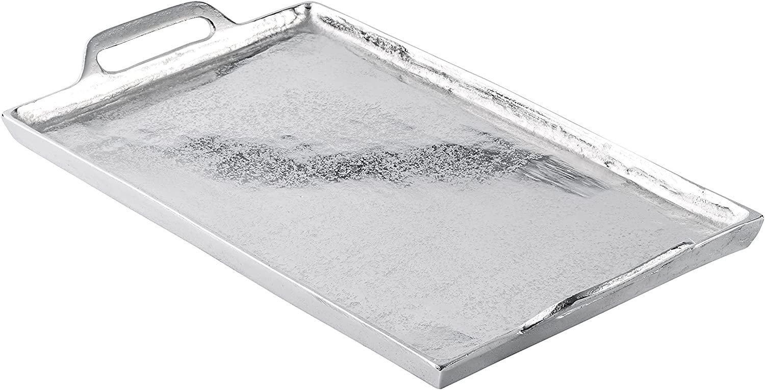 Wunderschönes Tablett aus Aluminium mit seitlichen Griffen. Die Oberfläche des Tabletts ist in einer "Raw-Optik" gehalten. Das Tablett ist sehr stabil verarbeitet und sorgt somit für einen sicheren Transport von Getränken und Snacks. Natürlich eignet sich das Tablett auch bestens zur Tischdekoration, bestückt mit Kerzen oder kleinen Windlichtern. Ein toller Blickfang für deine vier Wände. Das stilvolle Tablett in der Farbe Silber eignet sich auch als Deko-Highlight in der Gastronomie. Das Ambiente eines angesagten Restaurants oder einer eleganten Bar wird sicherlich durch das Tablett noch weiter aufgewertet. Bei der Nutzung für Lebensmittel, sollten immer Tortendeckchen oder Servietten darunter gelegt werden. Das Tablett ist zu 100 % handgefertigt und somit ein Unikat.