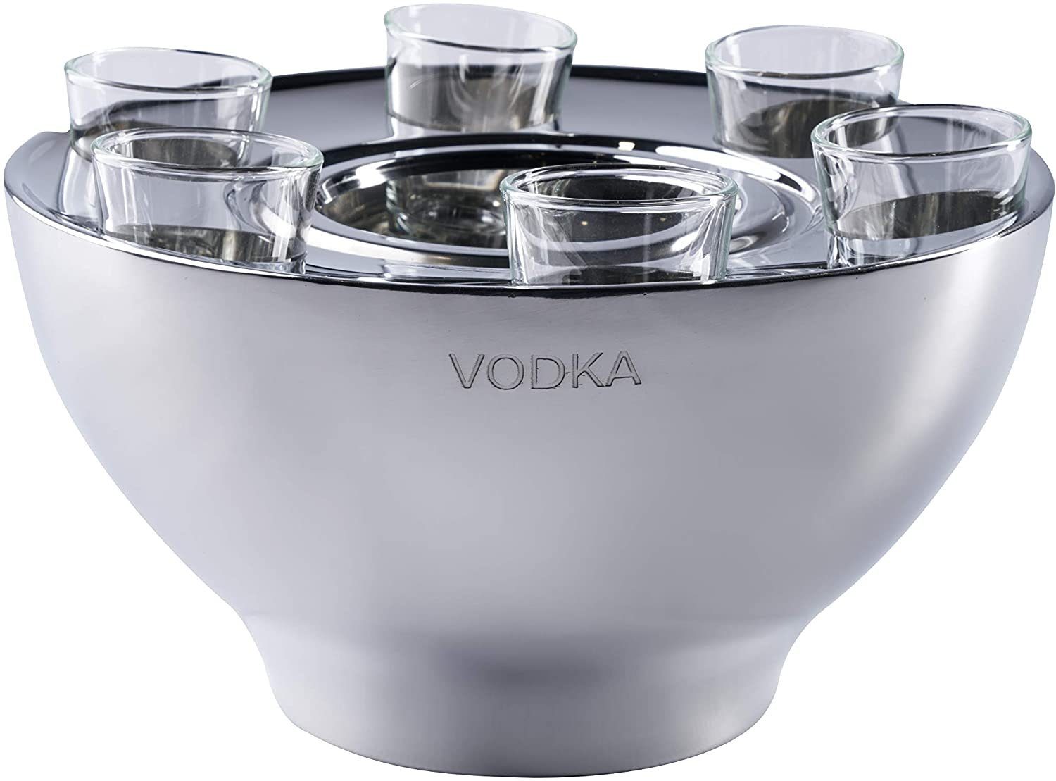 Stylischer Wodkakühler aus Edelstahl inkl. 6 Shotgläsern. Der Kühler ist nicht nur praktisch, sondern auch garantiert ein Hingucker. Es fehlt nur noch eine gute Flasche Wodka und ein gemütlicher Abend mit Freunden kann beginnen. Selbstverständlich ist der Wodkakühler auch ein Blickfang in der Gastronomie. In einer schicken Bar, einem angesagten Club, oder einem hochklassigen Hotel, lässt sich mit diesem Kühler perfekt eine Flasche Wodka servieren. Der Getränkekühler ist natürlich auch das perfekte Geschenk für deine Freunde und Liebsten. Der silberfarbene Kühler aus Edelstahl wurde in Handarbeit gefertigt, daher können immer leichte Abweichungen auftreten. Auf der Unterseite des Kühlers befindet sich ein Kratzschutz.