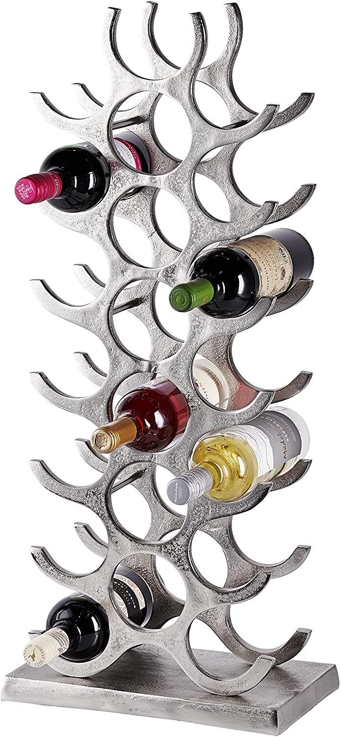 Dieses wunderschöne Flaschenregal hat Platz für bis zu 21 Flaschen deiner Lieblingsweine. Das Regal ist nicht nur eine praktische Lagerungsmöglichkeit, sondern auch optisch ein Highlight. Der absolute Hingucker für deine vier Wände, oder auch in der Gastronomie. Gefertigt wurde das Weinregal aus hochwertigem und massivem Aluminium, was es extrem langlebig macht. Das Flaschenregal ist in einem Raw-Design gehalten. Das bedeutet, dass das Regal nach dem Guss nicht mehr poliert wurde. Jedes der Flaschenregale besitzt somit seine ganz eigene Oberflächenstruktur. Die Farbe Silber lässt das Flaschenregal sehr edel wirken. Durch den breiten Standfuß steht das Weinregal sehr stabil auf dem Boden und kann ohne Bedenken bestückt werden. Das Flaschenregal ist handgefertigt und somit ein kleines Unikat. Die Lieferung erfolgt exklusive Dekoration.