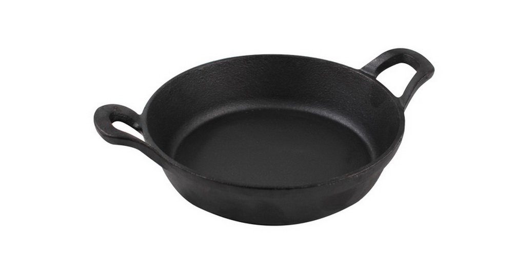 Diese runde gusseiserne Pfanne ist perfekt für die Zubereitung und Servieren von Speisen.