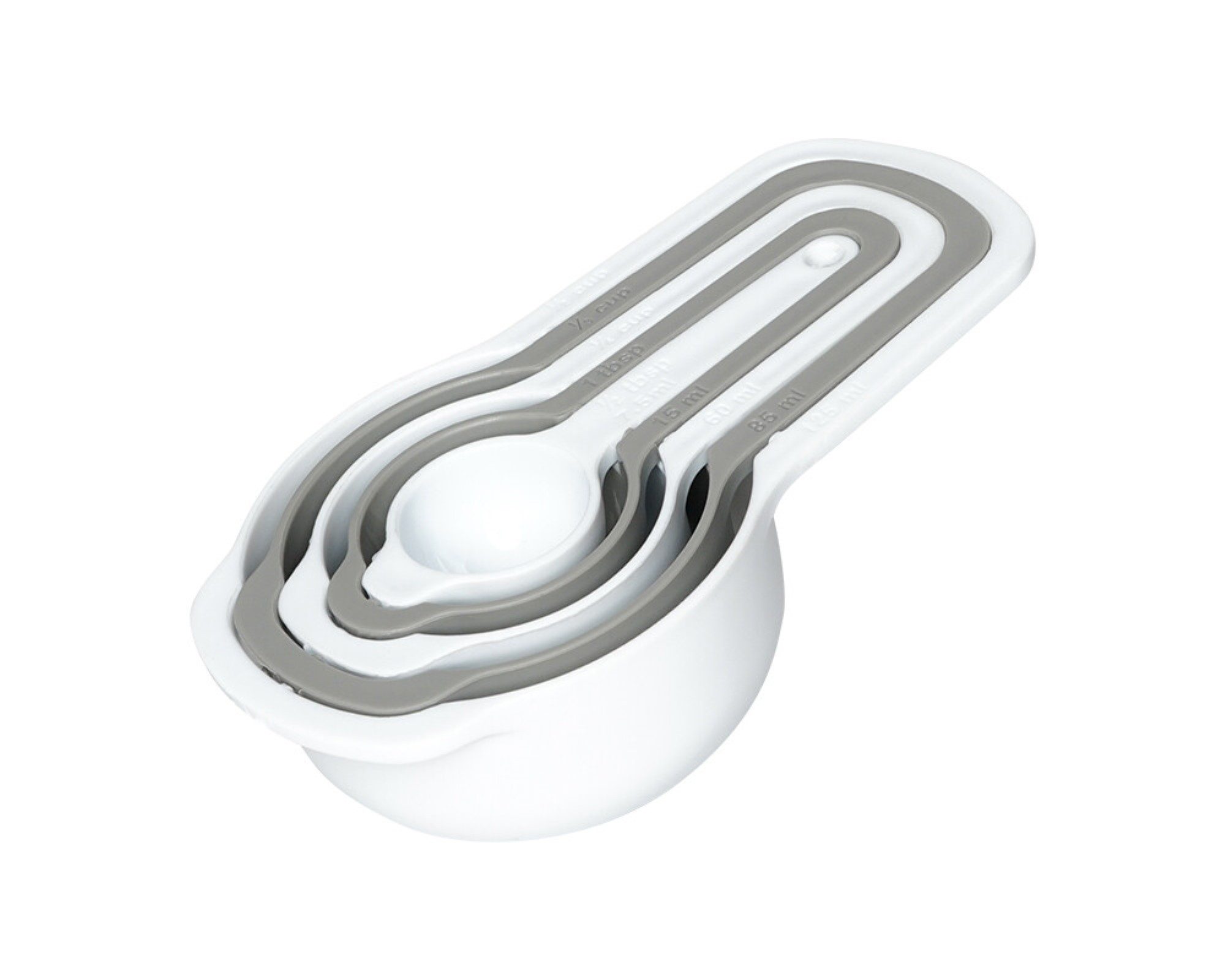 Dank des platzsparenden Designs lassen sich die Löffel ineinander stapeln und einfach verstauen. Der ergonomische Griff sorgt für eine angenehme Handhabung, während die langlebige Kunststoffkonstruktion für eine lange Lebensdauer ausgelegt ist. Die elegante Kombination aus Weiß und Grau verleiht dem Set einen modernen Look.