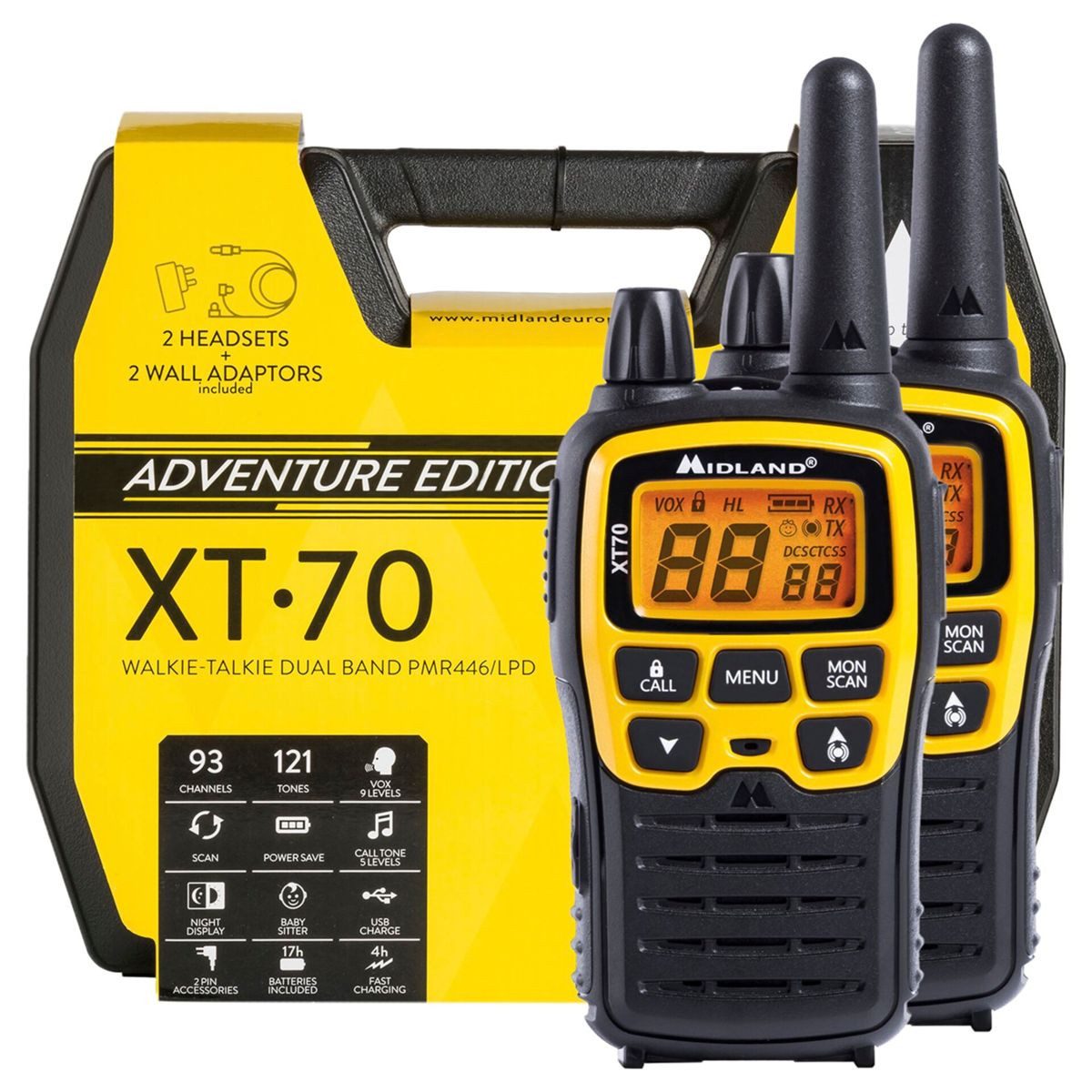 Ein einfach zu bedienendes PMR446 Handfunkgerät mit allen wichtigen Funktionen. Es verfügt über 8 PMR446 Kanäle, sowie 69 LPD Kanäle. Für ungestörte Gespräche stehen 38 CTCSS- und 83 DCS-Töne (Unterkanäle) zur Verfügung, Nachrauschunterdrückung, Vox- Freisprechfunktion, Ruf-Funktion (CALL) und Kanalsuchlauf sowie ein alphanumerisches LC-Display. Die Leistung beträgt 500 mW ERP. Das Funkgerät verfügt über einen 2-poligen MIC/SPK- Zubehöranschluss und einer Micro-USB-Ladebuchse. Das Midland XT70 wird als 2er-Kofferset angeboten.
