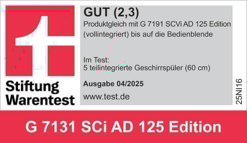 Testurteil von Stiftung Warentest vom 27.03.2025, Ausgabe 04/2025, Seite 42-47: "GUT (2,3) - Produktgleich mit G7191 SCVi AD 125 Edition (vollintegriert) bis auf die Bedienblende"