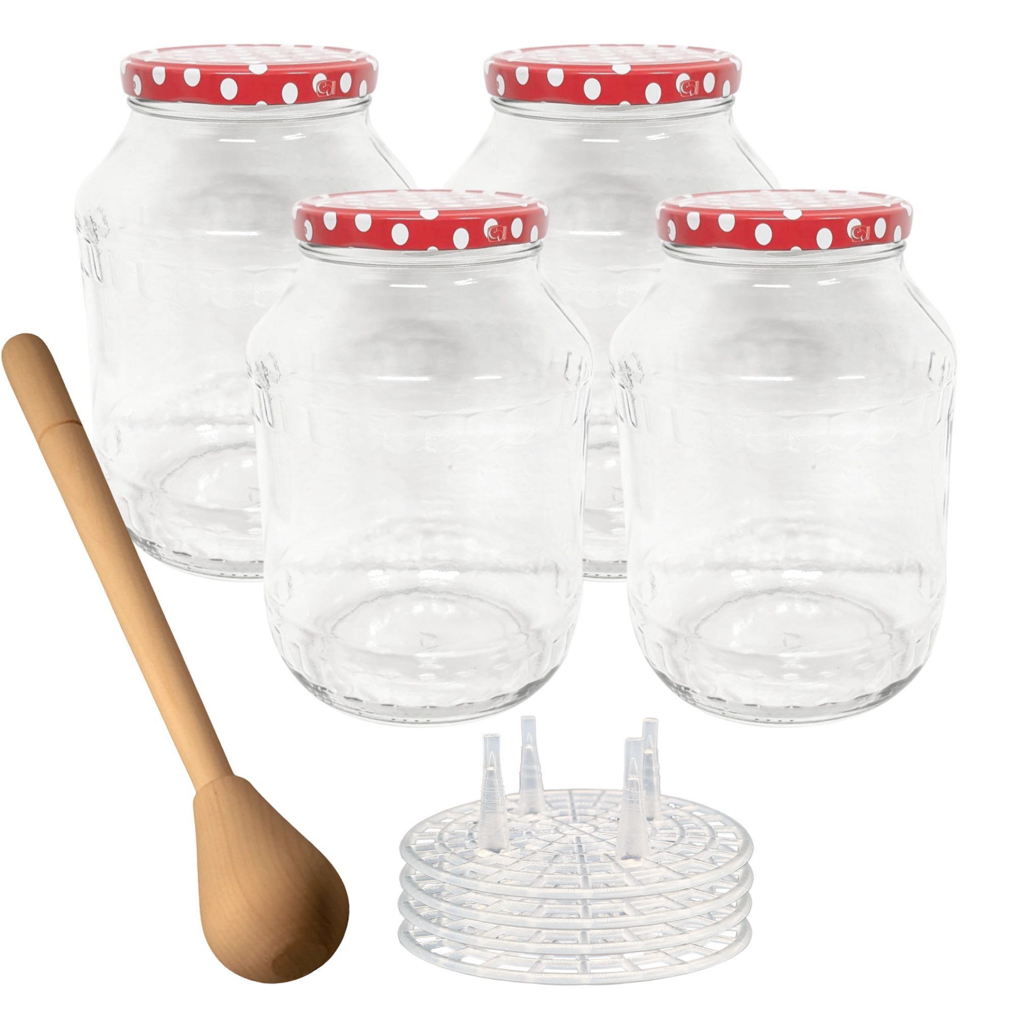 Fermentieren leicht gemacht! Dieses Starter Set zum Fermentieren bietet Ihnen alles, was Sie benötigen, um gesunde, probiotische Lebensmittel selbst herzustellen. Enthalten sind vier großzügige 2,65-Liter-Gläser, die ideal für große Mengen geeignet sind, sowie passendes Zubehör wie Fermentiergitter, einen Holzstößel und stilvolle rot-weiß gepunktete Twist-Off-Deckel (TO 100). Perfekt für Einsteiger und erfahrene Fermentier-Fans gleichermaßen.