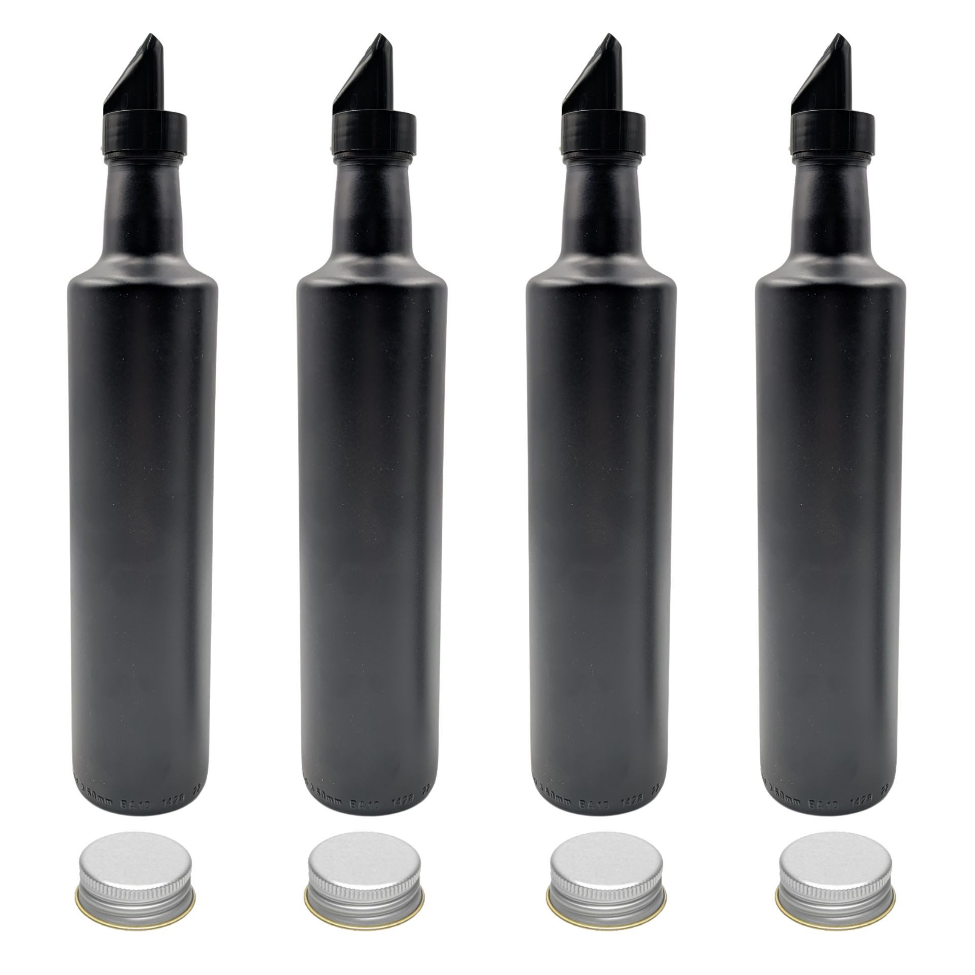 Dieses 4er Set hochwertiger Ölflaschen von mikken vereint modernes Design mit praktischer Funktion. Die Flaschen aus matt schwarz beschichtetem Glas fassen je 500 ml und sind ideal geeignet für Speiseöle, Essig, Dressings oder andere flüssige Zutaten im Alltag. Durch die stilvolle Optik machen sie auch auf dem Esstisch eine gute Figur.