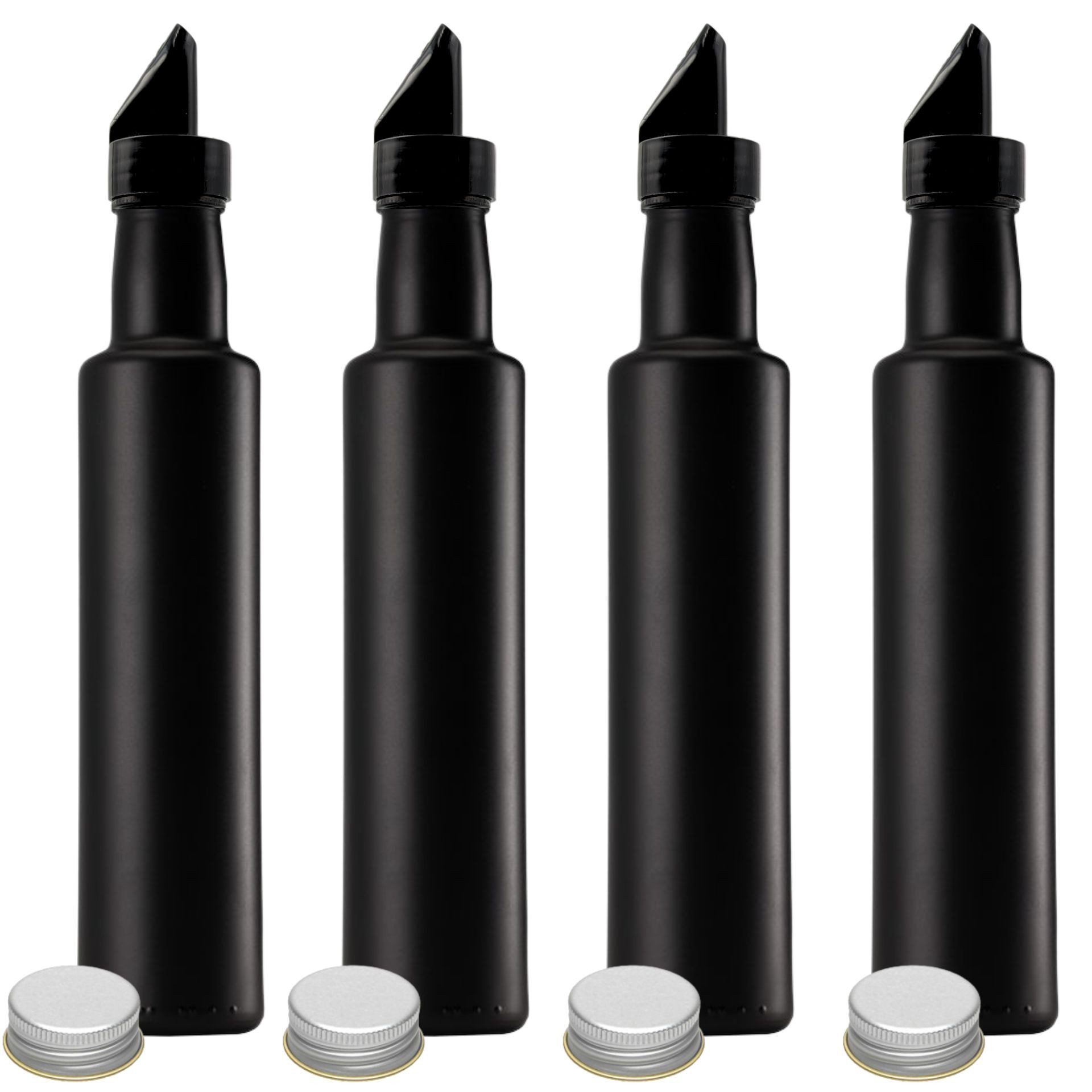 Das 4er-Set von mikken besteht aus vier hochwertigen Ölspendern aus matt schwarz beschichtetem Glas – perfekt zum stilvollen Servieren und sicheren Aufbewahren von Öl, Essig, Dressings oder anderen Flüssigkeiten. Die runde Flaschenform ist nicht nur optisch ansprechend, sondern auch besonders handlich und funktional im Gebrauch.
