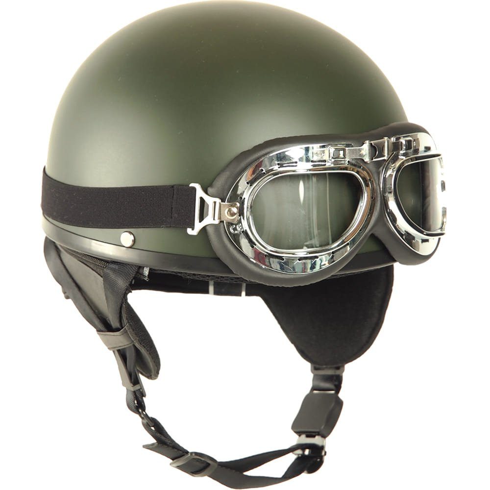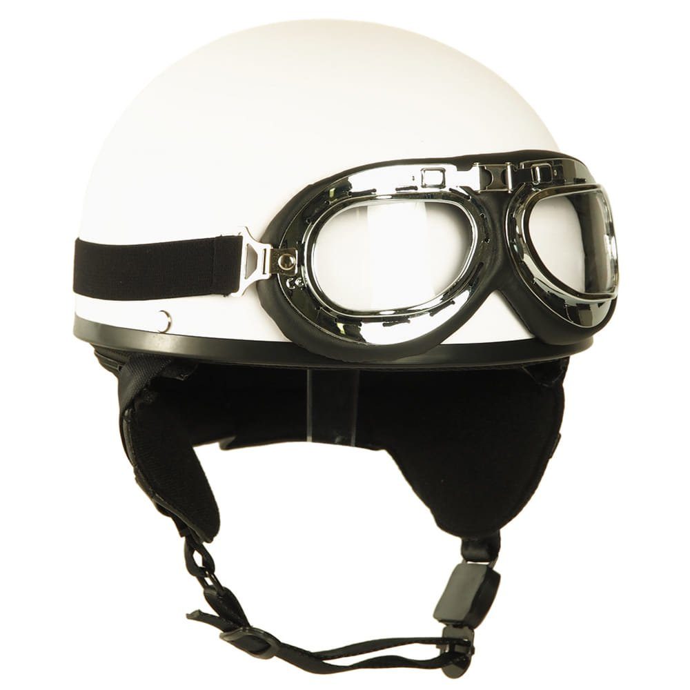 Der leichte und vielseitig nutzbare Motorradhelm aus den 50er Jahren. Er ist aus bruchfestem ABS Kunststoff gefertigt und im Retro-Look gehalten, daher verschafft er das Originale Aussehen der ehemaligen DDR Halbschale. Der Retro Helm bietet ebenso guten Komfort durch ein weiches, schweißaufsaugendes Innenfutter mit Meshgewebe. Das zusätzliche Highlight bietet die dazugehörige Fliegerbrille mit starken Gläsern und einer Anti-Beschlagschichtung.