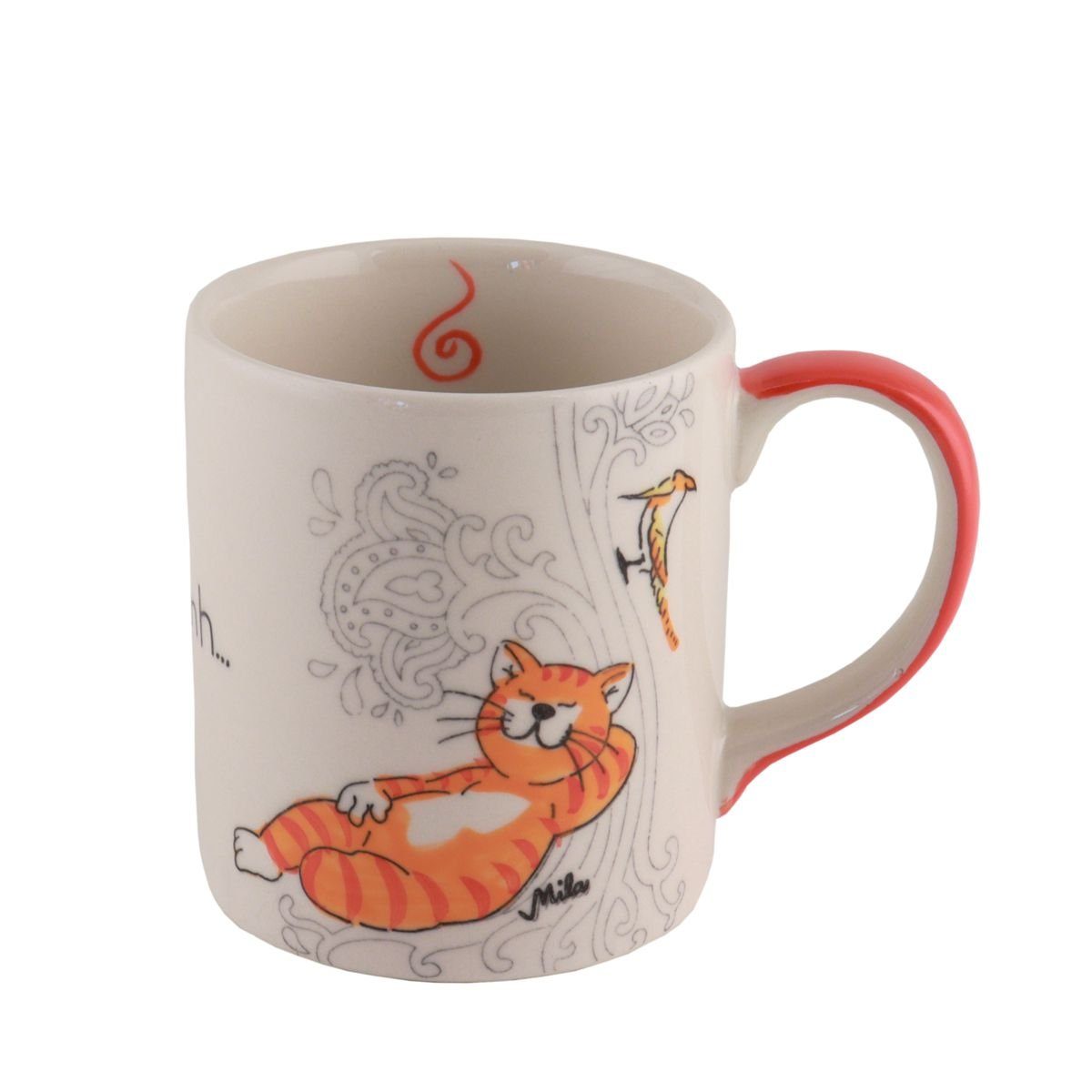 Mila Keramik-Becher Oommh Katze Take your Time Ganz relaxed beim Waldbaden träumt die Oommh Katze der Erleuchtung entgegen. Der handbemalte Keramikbecher wird zum Kraftspender sobald Sie ihn mit Tee oder Kaffee auffüllen. Da stört auch das Pock-pock vom rastlosen Herrn Specht nicht, wenn es heißt: Quality Time genießen und innere Ruhe finden. Im Lieferumfang enthalten: Tasse, Produktanhänger mit Qualitäts- und Handarbeitsmerkmalen Material: lebensmittelechte Keramik in höchster Qualitätsstufe, fair produziert aus ISO zertifiziertem Betrieb, von Hand bemalt Maße: ca. 9 cm x 12 cm x 8 cm (HxBxT) Füllmenge: ca. 250 ml Hinweis: die Tasse ist spülmaschinenfest. Der Keramikbecher ist handbemalt, geringe Abweichungen vom Bild sind daher Ausdruck individueller Handwerks-Kunst. Dieses Angebot gilt für ein Stück Mila Keramik-Becher, Motiv: Oommh Katze Take your Time, Artikel MI-80286, ohne Deko oder sonstigem Zubehör.