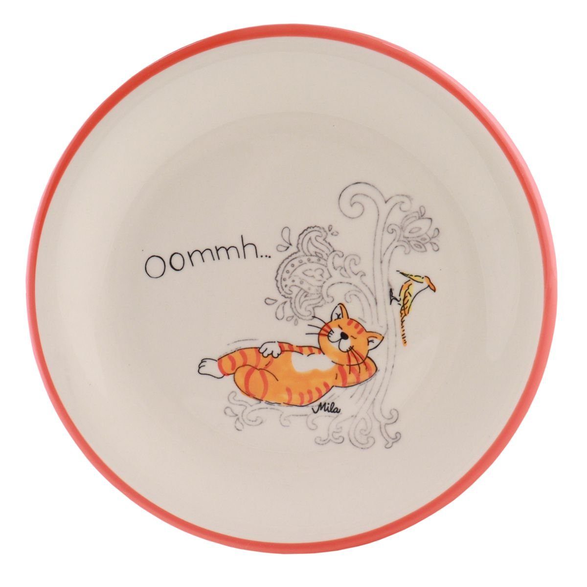 Mila Keramik-Teller Oommh Katze Take your Time Sieht man der liebevoll von Hand kolorierten Oommh Katze beim entspannten Waldbaden zu, breitet sich ganz automatisch Ruhe & Wohlbefinden aus. Da stört nicht mal mehr der rastlose Herr Specht. Material: lebensmittelechte Keramik in höchster Qualitätsstufe, fair produziert aus ISO zertifiziertem Betrieb, von Hand bemalt Maße: ca. 2,5 cm x 22 cm (HxD) Hinweis: Der Teller ist spülmaschinenfest. Der Keramikteller ist handbemalt, geringe Abweichungen vom Bild sind daher Ausdruck individueller Handwerks-Kunst. Dieses Angebot gilt für ein Stück Mila Keramik-Teller, Motiv: Oommh Katze Take your Time, Artikel MI-84286, ohne Deko oder sonstigem Zubehör.