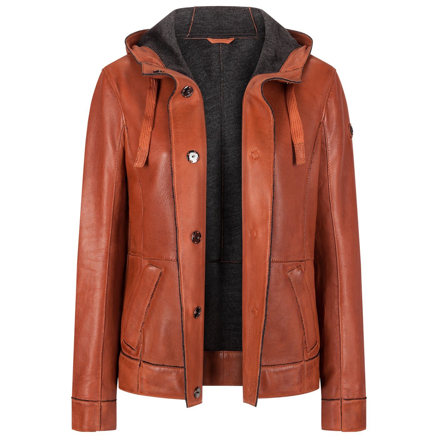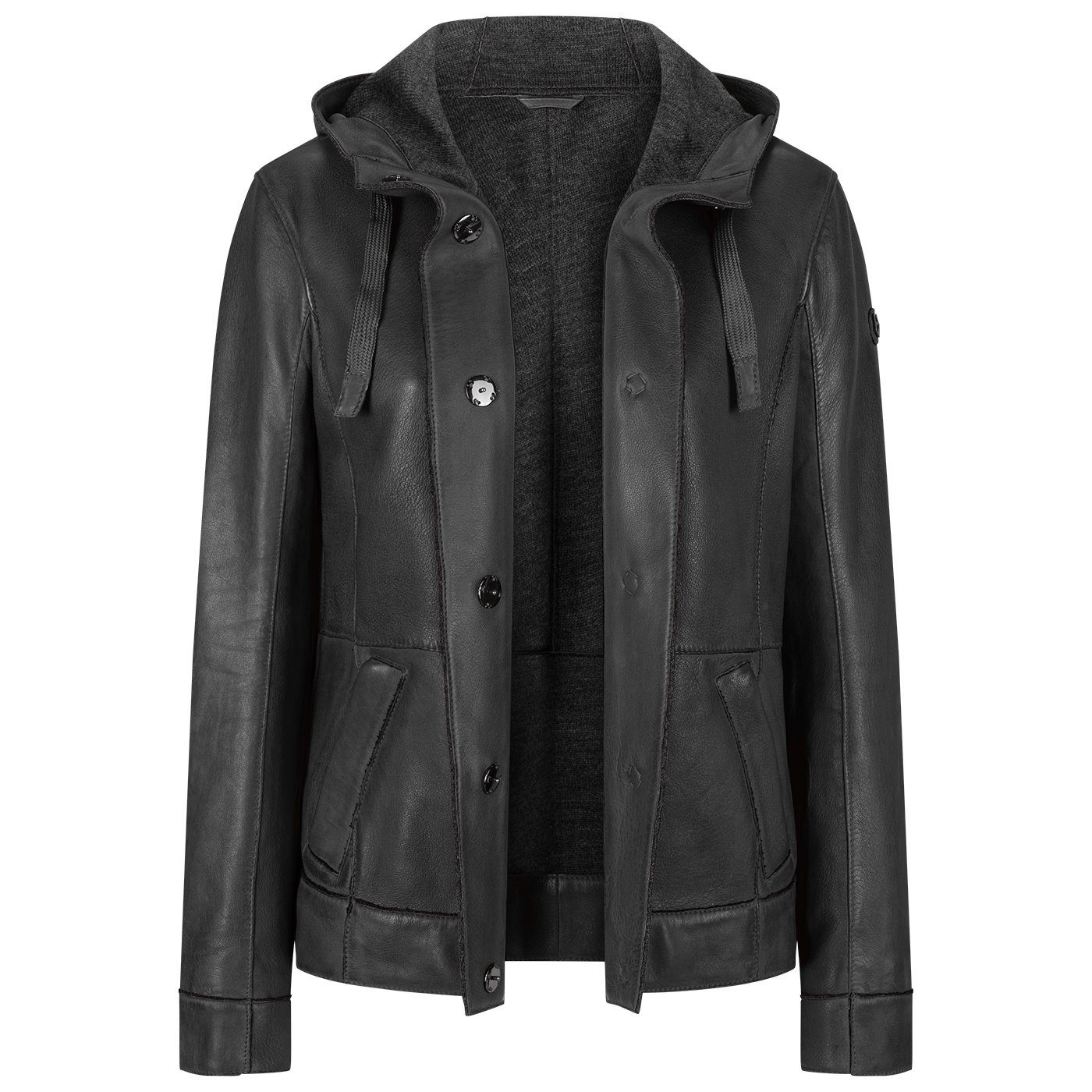 Eine stylishe Lederjacke aus dem Hause MILESTONE - Das Kapuzen-Detail rundet dieses Piece perfekt ab und sorgt für einen lässigen Look! Lässige Hoodie- Lederjacke mit geschnittenen Kanten und fester Kapuze. Leichtigkeit durch all over Strick-Bondierung. Leicht kastige Form mit überschnittenen Schultern. Patentaschen und handangenähte Metalldrucker in Frontverschluss. Schaf Nappa 0.3/0.4 mm kompakt,feine Narbenstruktur Leichter 2-tone look durch dunkleres Wachs, knautschige Waschoptik durch Bondieren mit meliertem leichtem Strick. 100% Pan Wollbonding 100% Pes Ärmelfutter 100% Co TB-Futter