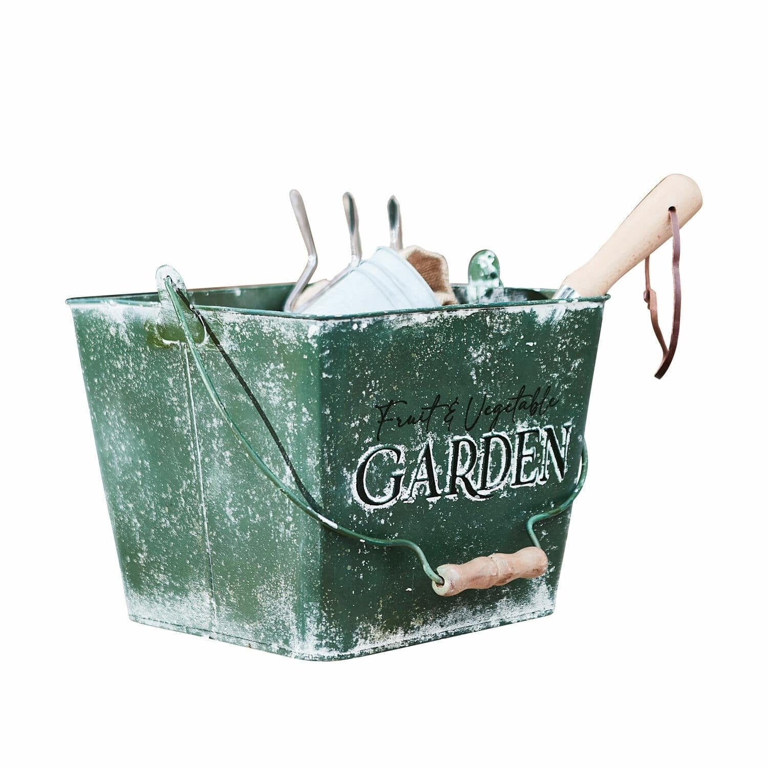 Vintage-Flair für Haus und Garten. Stiltypisch mit nostalgischem Schriftzug, antiker Patina und Tannenholzgriff. Aus stabilem Eisen. Es gibt Haushaltsutensilien, da käme man normalerweise nie auf den Gedanken, sie wegen ihres Aussehens zu kaufen. Nehmen wir nur einen Eimer, in dem man Abfälle der verschiedensten Art sammelt, um sie anschließend zu entsorgen. Doch mit etwas Glück findet man ein Exemplar, das sich von den übrigen wohltuend abhebt und eine bezaubernd nostalgische Ausstrahlung hat. Wie dieser Eimer. Er ist nicht aus Plastik wie viele andere, sondern wurde von Hand aus Eisen gefertigt und mit einem Grünton lackiert, wie er typisch ist für englische Gewächshäuser, Obelisken und ähnliche Garten-Accessoires. Außerdem trägt der Eimer eine Beschriftung, die andeutet, dass er hauptsächlich im Garten Verwendung fand. Liebenswerte Shabby-Spuren und der gedrechselte Griff aus Tannenholz machen den antiken Look perfekt.