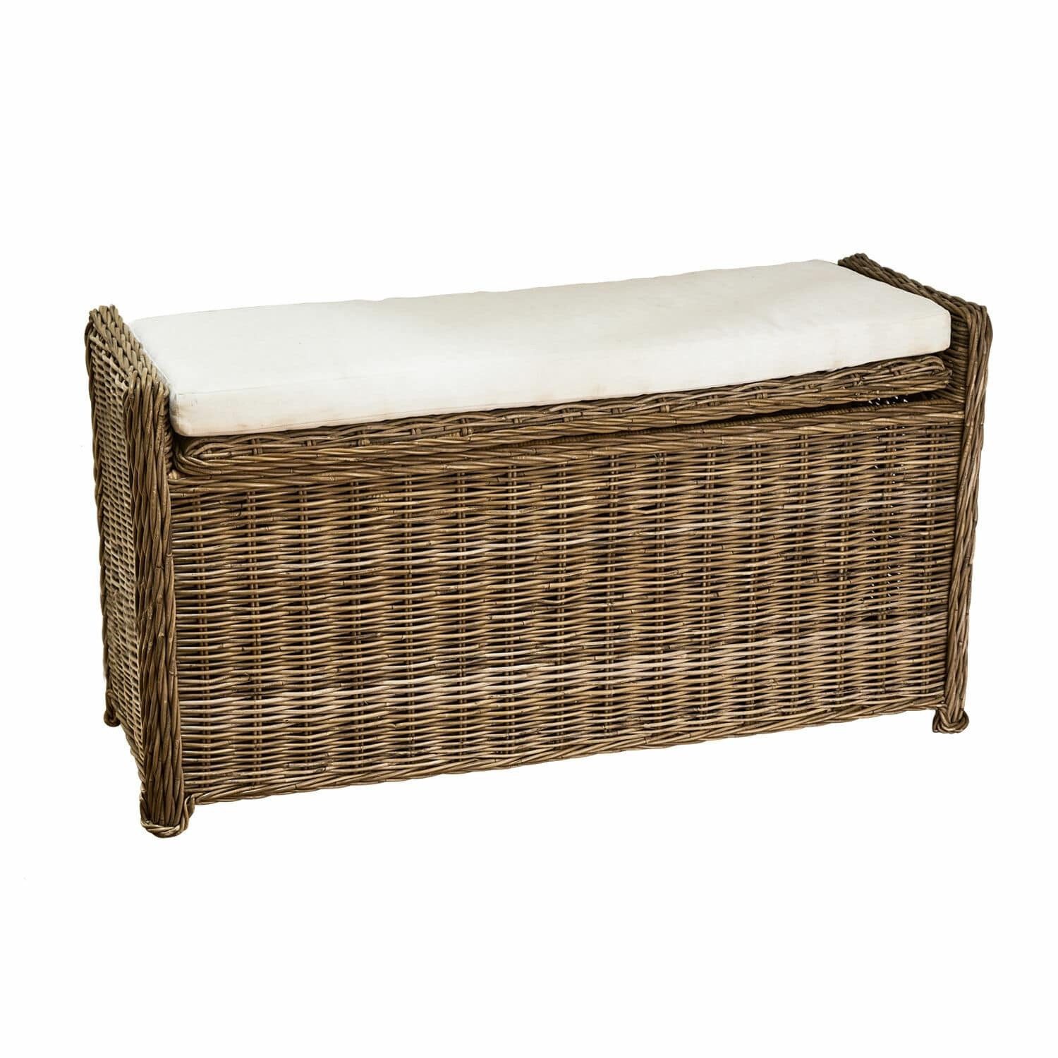 Aus Rattan um ein stabiles Mahagoniholzgestell handgeflochten. Mit weichem Sitzkissen. Mit viel Stauraum unterhalb der aufklappbaren Sitzfläche. Naturnaher Luxus im handlichen Format. Die wunderschöne Sitzbank ist eine tolle Ergänzung für jeden Raum, hiermit treffen Sie immer eine gute Wahl. Darin lässt sich vieles ordentlich verstauen. Ob Spielsachen der Kinder, Hundeleinen, Kissen, Bettwäsche, Socken oder andere Accessoires, hiermit ist es immer aufgeräumt. Klassisch, zeitlos und langlebig - eine Anschaffung, an der Sie lange Freude haben und die jedem Ambiente schmeichelt. Vielleicht platzieren Sie die Bank auch am Fenster und schaffen sich so einen schönen Sitz mit Aussicht.