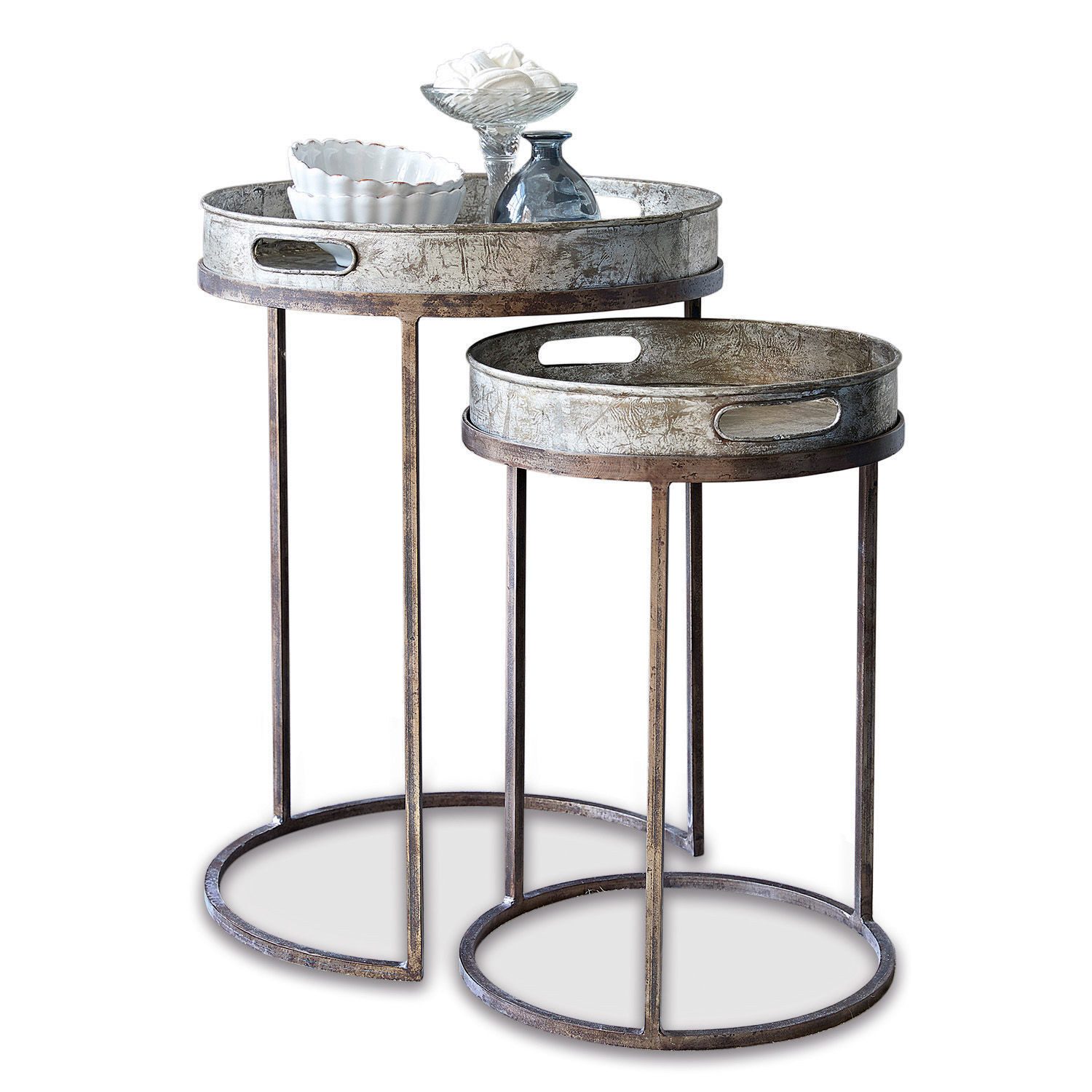 Flexibles Duo im Industrial Style. Aus Eisen, Tabletts mit Antik-Finish. Praktisch: Die Tische können ineinandergeschoben werden, die Tabletts sind abnehmbar. Zwei oder einer? Das ist hier die Frage, auf die nur Sie eine Antwort geben können. Und die je nach Situation mal so und mal so ausfallen darf, denn der Beistelltisch im 2er Set passt sich ganz flexibel Ihren Wünschen an. Heute machen Sie sich einen gemütlichen Filmabend zu Hause und ziehen den kleineren Tisch unter dem größeren hervor, so dass er Ihnen ausreichend Platz für Getränke und Snacks neben Ihrem Lieblingssessel bietet. Morgen schieben Sie die beiden Tische wieder zusammen, um mehr Platz im Raum zu haben. Das Beste dabei: Der Beistelltisch im 2er Set ist auch optisch gelungen. Die schlichte Formgebung harmoniert perfekt mit dem dunklen Eisen, das dem Tisch den angesagten Industrie-Chic verleiht, während die Tischplatten ein edles Antik-Finish zeigen. Und weil bei diesem Beistelltisch im 2er Set die Tischplatten in Wirklichkeit zwei Tabletts sind, können Sie sie bei Bedarf abnehmen und mit Hilfe der komfortablen Griffmulden in die Küche tragen, um wenig später Ihren Gästen formvollendet etwas anzubieten.