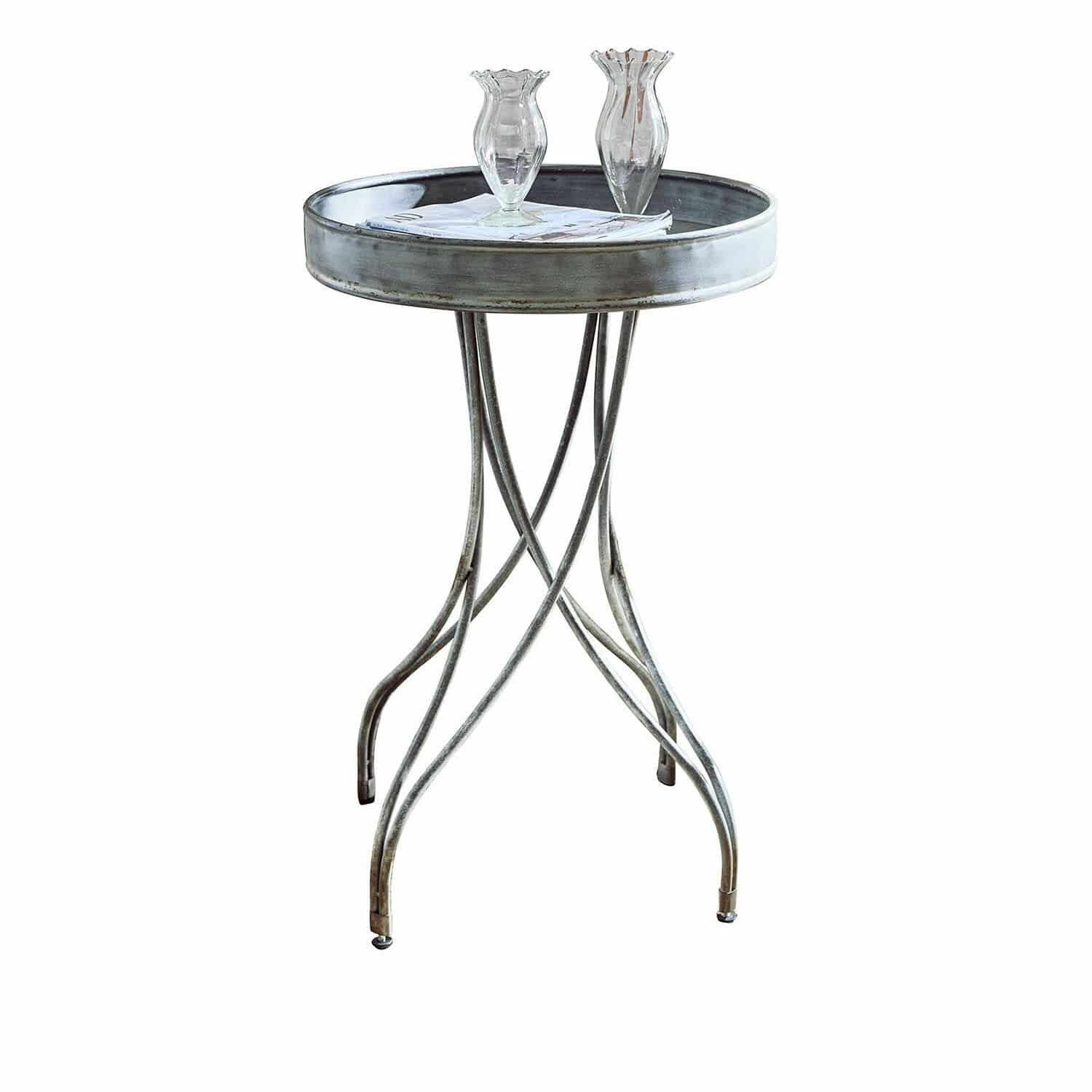 Aus Eisen mit antikgrauem Finish. Praktisch erhöhter Rand, ideal zum sicheren Abstellen von Gegenständen. Filigran verschlungene Tischbeine verleihen dem Design Leichtigkeit und Charme. Dieser Beistelltisch aus Eisen besticht durch sein antikgraues Finish und seine filigran verschlungenen Beine. Die runde Tischplatte mit hohem Rand bietet zusätzlichen Schutz für abgestellte Gegenstände und fügt gleichzeitig einen dekorativen Akzent hinzu. Perfekt, um jedem Raum eine Prise Vintage-Charme zu verleihen.