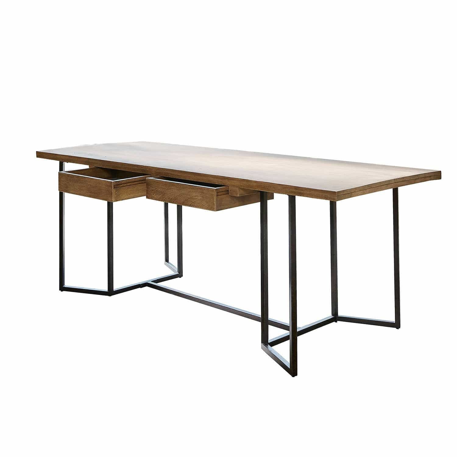 Ein modernes Eisengestell trägt eine Platte aus massivem Mangoholz. Optisches Highlight ist die ausdrucksstarke Maserung der Platte. Vier Schubladen mit verdeckten Griffmulden. Holz und Metall sind seit Jahrhunderten ein arriviertes Material-Team, das Möbeln das gewisse Etwas mit auf den Weg gibt. Dieser Esstisch hat ein schlankes, aber sehr stabiles Gestell aus schwarzem Eisen, das eine massive Tischplatte aus Mangoholz trägt. Das Holz des tropischen Mangobaums hat seit einigen Jahren die Werkstätten ambitionierter Möbel-Designer erobert, denn das Naturmaterial begeistert mit einer besonders lebendigen Maserung, die sich hier auf der imposant großen Tischplatte besonders beeindruckend präsentieren kann. Doch neben der exklusiven Optik wird Sie der Esstisch auch mit seiner Funktionalität überzeugen. Unter der Tischplatte verstecken sich vier Schubladen, in denen Besteck, Servietten und vieles mehr ordentlich und griffbereit verstaut werden kann. Geöffnet werden die Schubladen ganz einfach mit den Griffmulden hinter der Schubladenfront. Und schließlich wurde der Esstisch in bester Manufaktur-Qualität gefertigt, was eine lange Lebensdauer garantiert, denn einen Esstisch kauft man sich ja nicht alle Tage neu, nicht wahr?