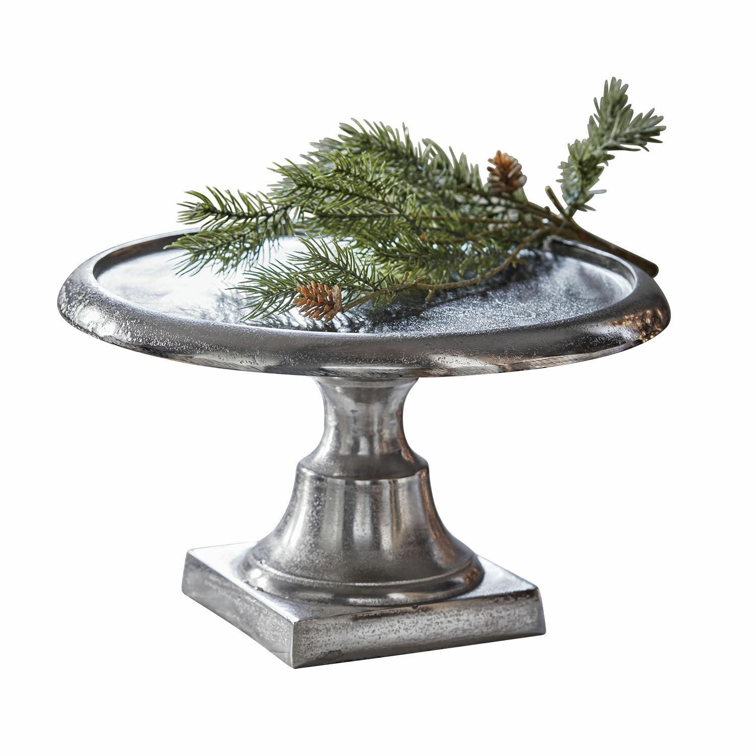 Strukturierte Oberfläche mit Antiksilber-Schimmer. Massiver Fuß für sicheren Stand. Ideal für Dekorationen mit Höhe und Präsenz. Diese Etagere aus strukturiertem Aluguss wirkt wie ein Erbstück aus einem alten Salon. Ihr Antiksilber-Finish reflektiert das Licht auf besondere Weise und verleiht jedem Raum ein Hauch von Nostalgie. Auf einem stilisierten Fuß thronend, eignet sie sich perfekt zur dekorativen Inszenierung Ihrer liebsten Stücke. Bitte beachten Sie: nicht für den direkten Kontakt mit Lebensmitteln geeignet.