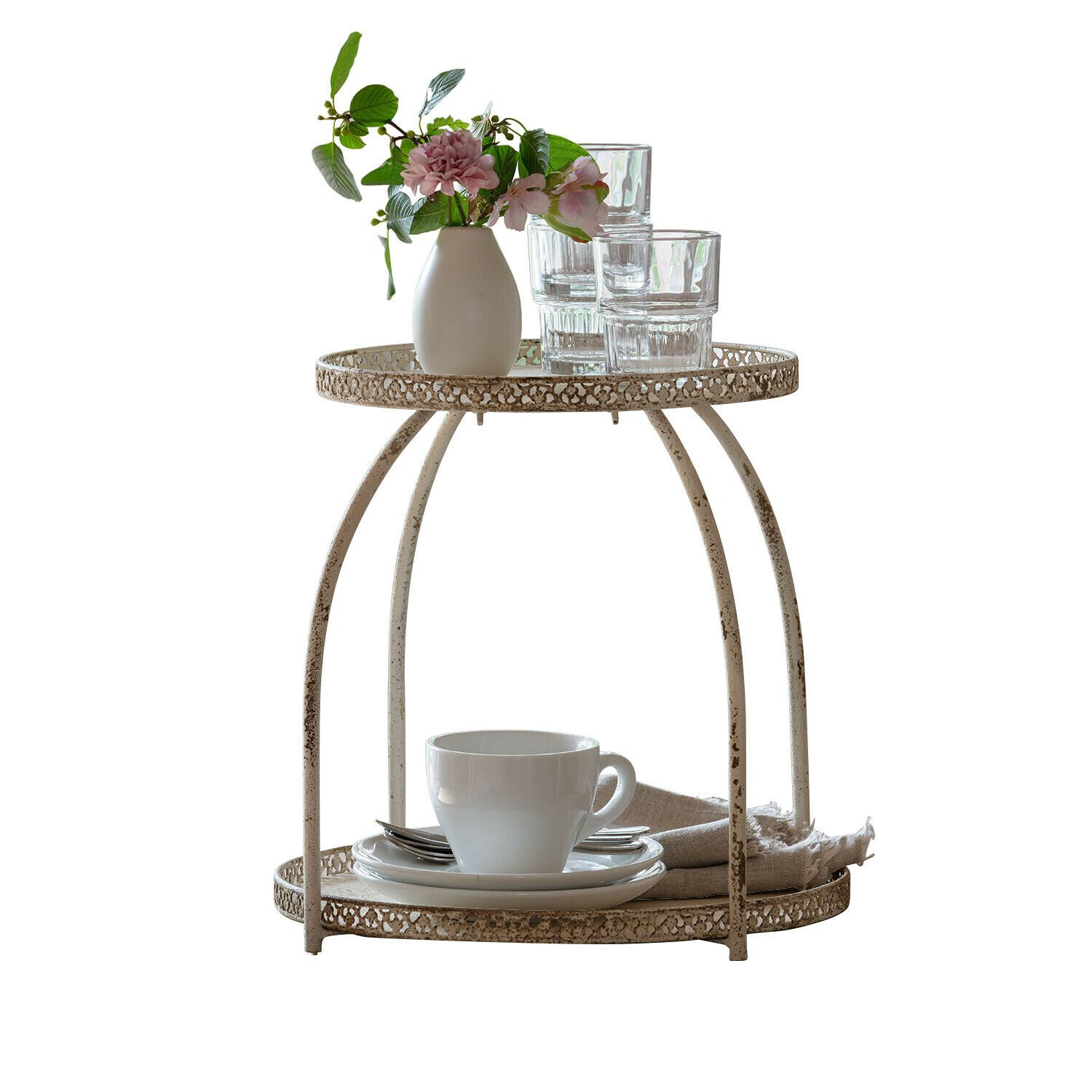 Zarte Ornamentik mit nostalgischem Charme. Aus Eisen mit antikweißer Patina – wie aus vergangener Zeit. Zwei Ebenen für zauberhafte Arrangements. Diese zweistöckige Etagere aus Eisen begeistert mit liebevoll durchbrochenem Rand und einem authentisch antikweißen Finish. Die Patina unterstreicht den nostalgischen Charakter und macht jede Etagere zu einem Unikat. Auf zwei runden Ablagen lassen sich Dekoobjekte, Kerzen oder Leckereien gekonnt in Szene setzen. Ideal für Tisch, Sideboard oder Fensterbank.