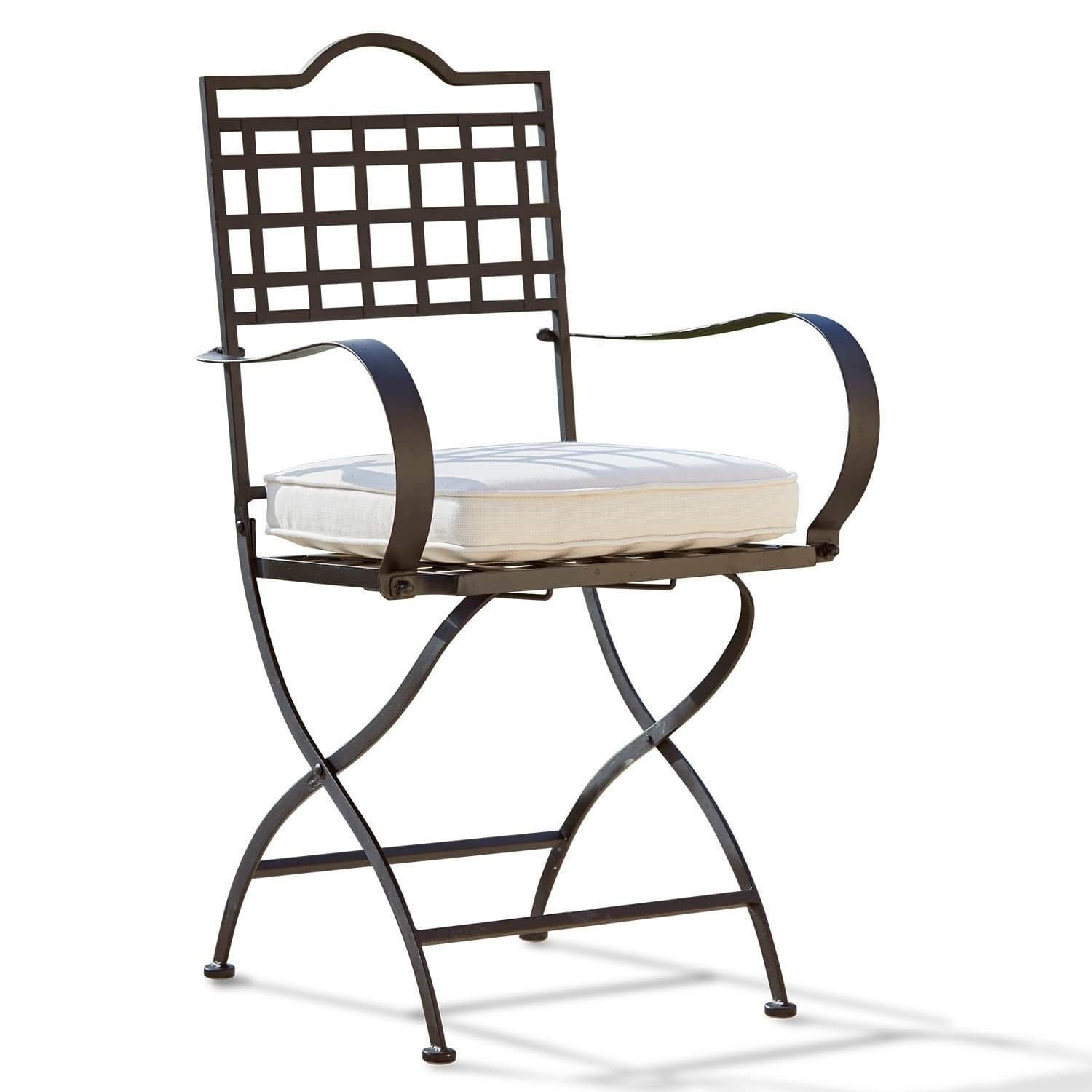 Kunstvoll aus Eisen gefertigt. Klappbar. Dekorativ geflochtene Optik. Ein hochwertiger Stuhl, der das perfekte Plätzchen für sonnige Tage und lauschige Sommernächte ist. Auf den schön geschwungenen Lehnen können sie ganz bequem die Arme ruhen lassen. Genießen Sie hierin entspannte Stunden im Freien, ob im Garten oder auf der Terrasse platziert. Das passende Sitzkissen dazu trägt den Namen Salome.