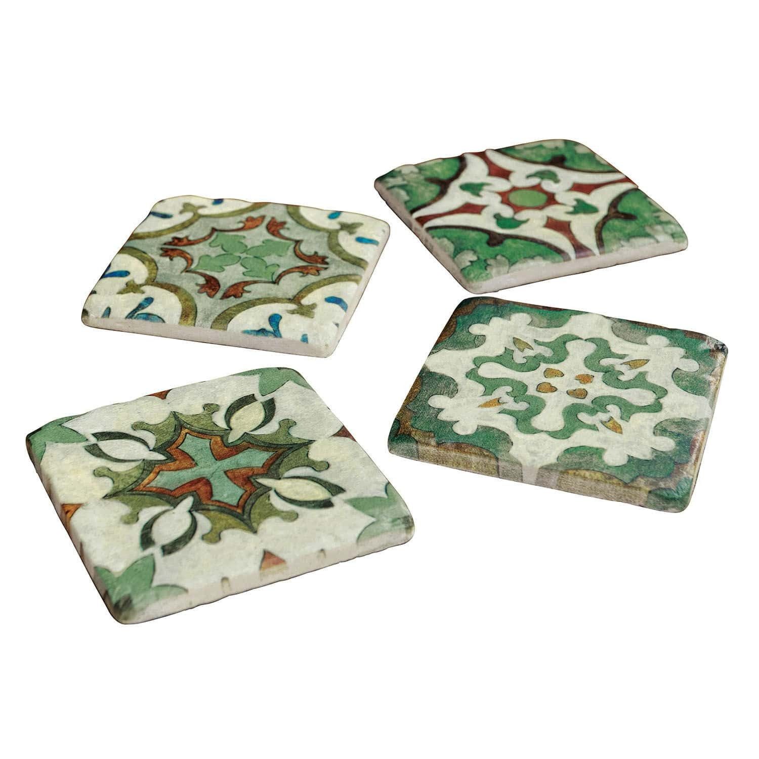 Orientalische Fliesen-Optik realisiert in modernem Kunststein. Traditionell von Hand bemalt. Mit rutschfester, möbelschonender Korkunterseite. Wer Möbel mit kostbaren Oberflächen hat, wird großen Bedarf an Untersetzern haben. Mit diesem Untersetzer 4er Set können Sie Ihre bisherige Sammlung um vier besondere Schönheiten erweitern. Das Set imitiert nämlich den antiken Keramikfliesen-Look, wie er vor Jahrtausenden im Orient erfunden und verfeinert wurde und dessen Zeugen man bis heute rund ums Mittelmeer als Boden- oder Wandschmuck bewundern kann. Mit dem handgemalten, geometrischen Ornament-Muster ähnelt das Untersetzer-Set zwar seinen antiken Vorbildern, wurde aber nicht aus Keramik, sondern aus dem modernen, robusten Kunststein Polyresin gefertigt. Außerdem hat jeder Untersetzer eine rutschfeste Korkunterseite, sodass Sie ihn unbesorgt auch auf empfindlichen Möbelflächen einsetzen können. Unter Gläsern, unter einer Vase oder auch solo ist jeder Untersetzer ein reizvolles Accessoire.