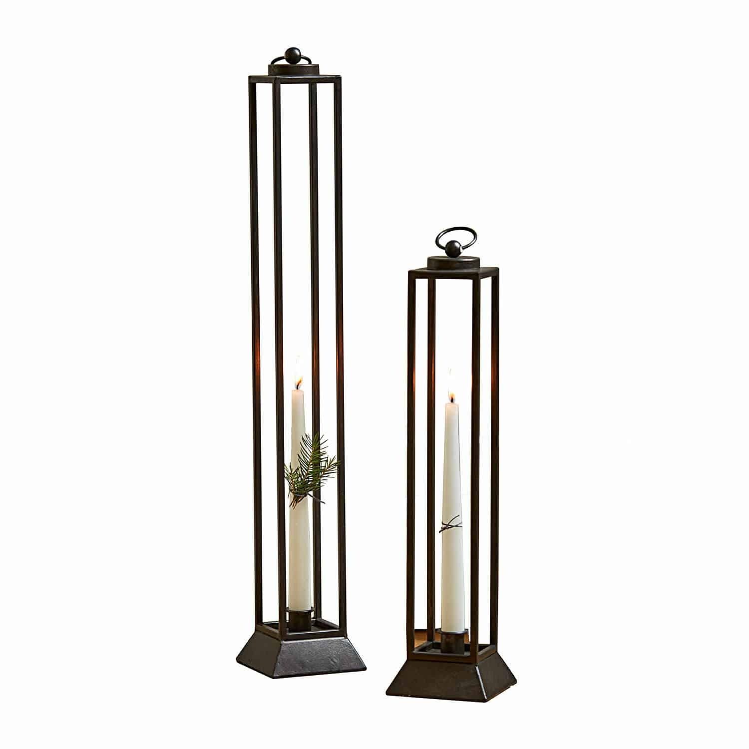 Laternen-Duo inklusive fester Halterung für Stabkerzen. Handgefertigt aus Eisen. Zeitlos eleganter Look. Mit diesem Laternen-Duo können Sie das ganze Jahr über sanftes und romantisches Kerzenlicht genießen und eine gemütliche Atmosphäre in Ihre vier Wände zaubern – ob an lauen Sommerabenden oder in frostigen Winternächten. Das zeitlos elegante Design dieser Laternen harmoniert mit einer Vielzahl von Einrichtungskonzepten. Die hochwertigen Lichtspender sind die perfekte Wahl für alle, die Wert auf Stil und Funktionalität legen. Jede Laterne verfügt über einen Halter für Stabkerzen, und das offene Design macht das Einsetzen und Auswechseln der Kerzen kinderleicht. Natürlich können Sie auch auf Kerzen verzichten und stattdessen eine LED-Girlande um die Streben drapieren oder das Ganze mit Deko-Objekten schmücken. Jede Laterne hat außerdem einen Ring an der Spitze, der den Transport erleichtert und es ermöglicht, die Laternen an Haken oder Ästen aufzuhängen.
