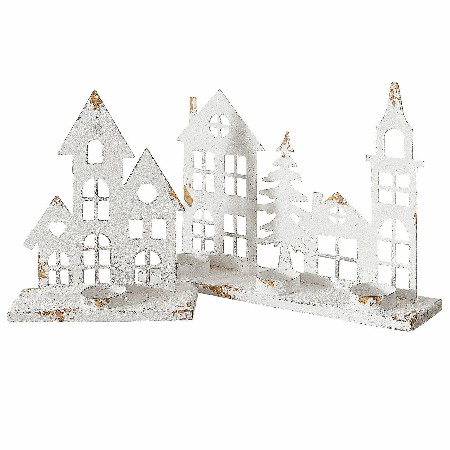 Charmante Häuserfronten mit rückseitiger Kerzenhalterung. Aus handbemaltem Eisen mit Antikweiß Finish. Hochwertige Verarbeitung mit liebevollen Details. Diese bezaubernden Kerzenständer im 2er Set bringen winterlichen Charme in Ihr Zuhause. Handbemaltes Eisen im Antikweiß Finish und die liebevoll gestalteten Häuserfronten mit ausgeschnittenen Fenstern und Türen schaffen eine nostalgische und gemütliche Atmosphäre. Perfekt für Teelichter oder kleine Stumpenkerzen, zaubern sie ein sanftes Licht und eine festliche Stimmung in jeden Raum. Bitte beachten Sie, dass Kerzen nicht im Lieferumfang enthalten sind.