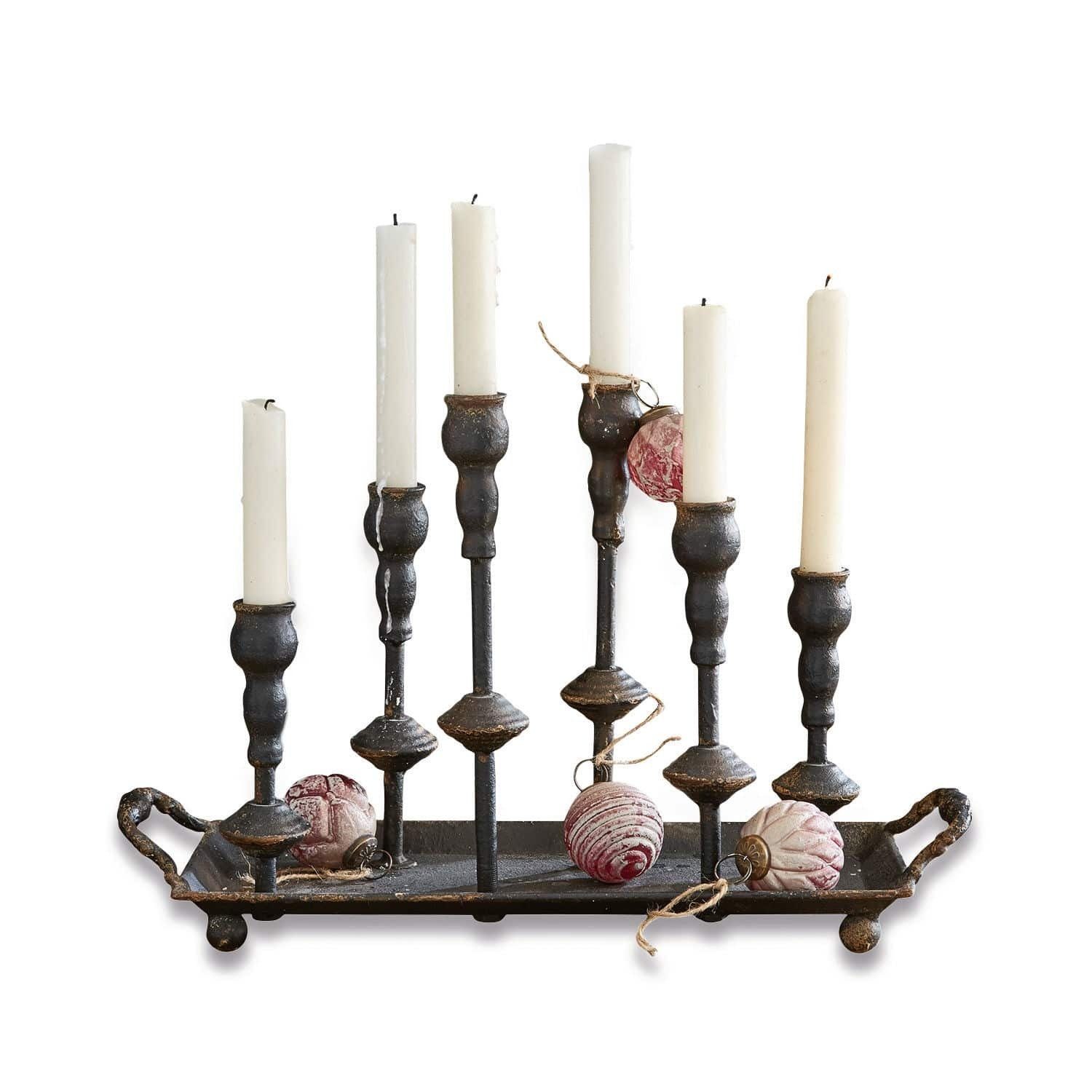 Exklusives Design eines Tabletts mit Kerzenständern. Aus Eisen mit authentischem Shabby-Finish. Ein Schmuckstück mit viel Möglichkeit zur Dekoration. Ein traumhaft schönes Kunstwerk, das pure Romantik mit einer ordentlichen Prise Shabby-Chic kombiniert. Sechs wohlgeformte Kerzenständer schmücken das Tablett und selbstverständlich sind sämtliche Elemente optisch perfekt aufeinander abgestimmt. Die kunstvoll geformten Griffe, die genau wie der Rest aus reinem Eisen gefertigt wurden, haben es uns besonders angetan. Das stilvolle Vintage-Finish verleiht dem Material eine gewisse Betagtheit, die fast schon wieder zeitlos wirkt. Kurz: Mit diesem Kerzenständer-Tablett sorgen Sie für heimelige und festliche Stimmung.
