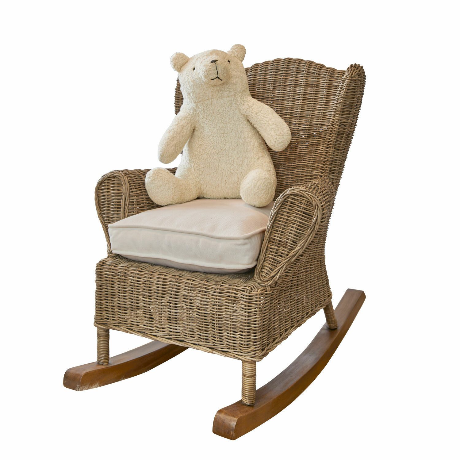 Robustes Mahagoniholz-Gestell und charmantes Rattangeflecht für natürliche Eleganz. Weiches, komfortables Baumwoll-Sitzkissen für gemütliche Schaukelerlebnisse. Pflegeleichter, abnehmbarer und waschbarer Sitzkissenbezug. Dieser bezaubernde Kinderschaukelstuhl vereint stilvolles Design mit hohem Komfort. Das robuste Gestell aus Mahagoniholz und das charmante Rattangeflecht strahlen natürliche Eleganz aus. Das bequeme Baumwoll-Sitzkissen mit waschbarem Bezug rundet das gemütliche Schaukelerlebnis perfekt ab.