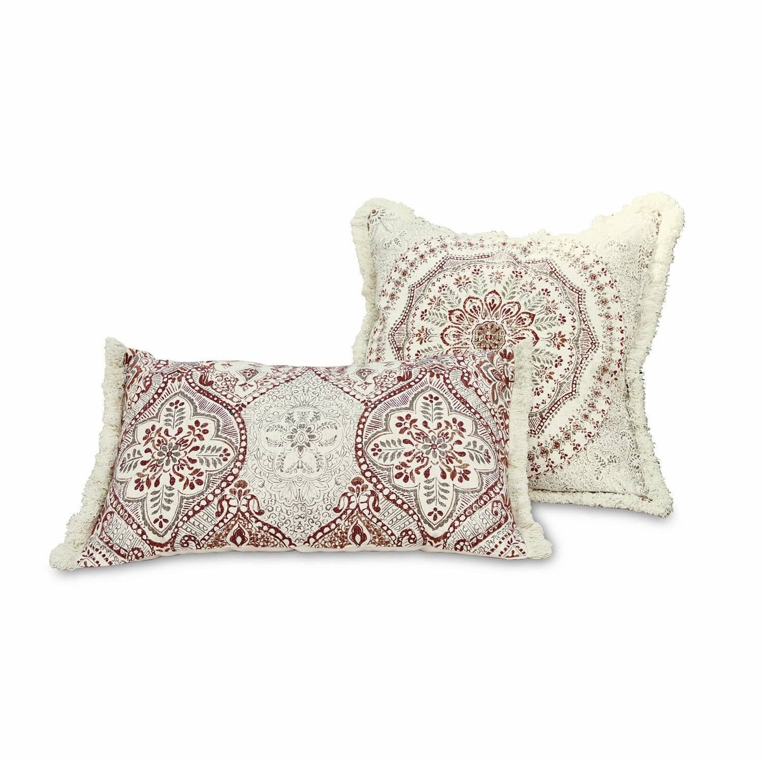 Verbreitet den Zauber des Orients. Hochwertiger Digitalprint auf reiner Baumwolle. Eine unifarbene Rückseite und sehr weiche Fransen runden das Design ab. Orientalisch anmutende Designs üben auf uns immer eine geheimnisvolle Faszination aus. Diese üppigen, oft streng symmetrischen Muster mit langer Tradition verstehen sich vorzüglich darauf, einen Hauch Exotik zu verbreiten. Die Designs auf dieser Kissenhülle im 2er Set sind so grazil und detailreich, als wären sie sorgfältig mit einem spitzen Stift gezeichnet, tatsächlich sind sie aber das Ergebnis eines hochwertigen Digitalprints, der die Farben auf dem weißen Untergrund sommerlich frisch und fröhlich wirken lässt. Und wie Sie das von Kissen erwarten dürfen, die Sie im Sommer mit auf die Terrasse und den Balkon begleiten und an die Sie sich auch mal mit nackter Haut kuscheln, wurde als Material für die Kissenhülle feine, reine Baumwolle gewählt. Die Rückseite ist uni weiß und hat einen Reißverschluss. Bei Bedarf können Sie jede Kissenhülle einfach in der Maschine waschen.