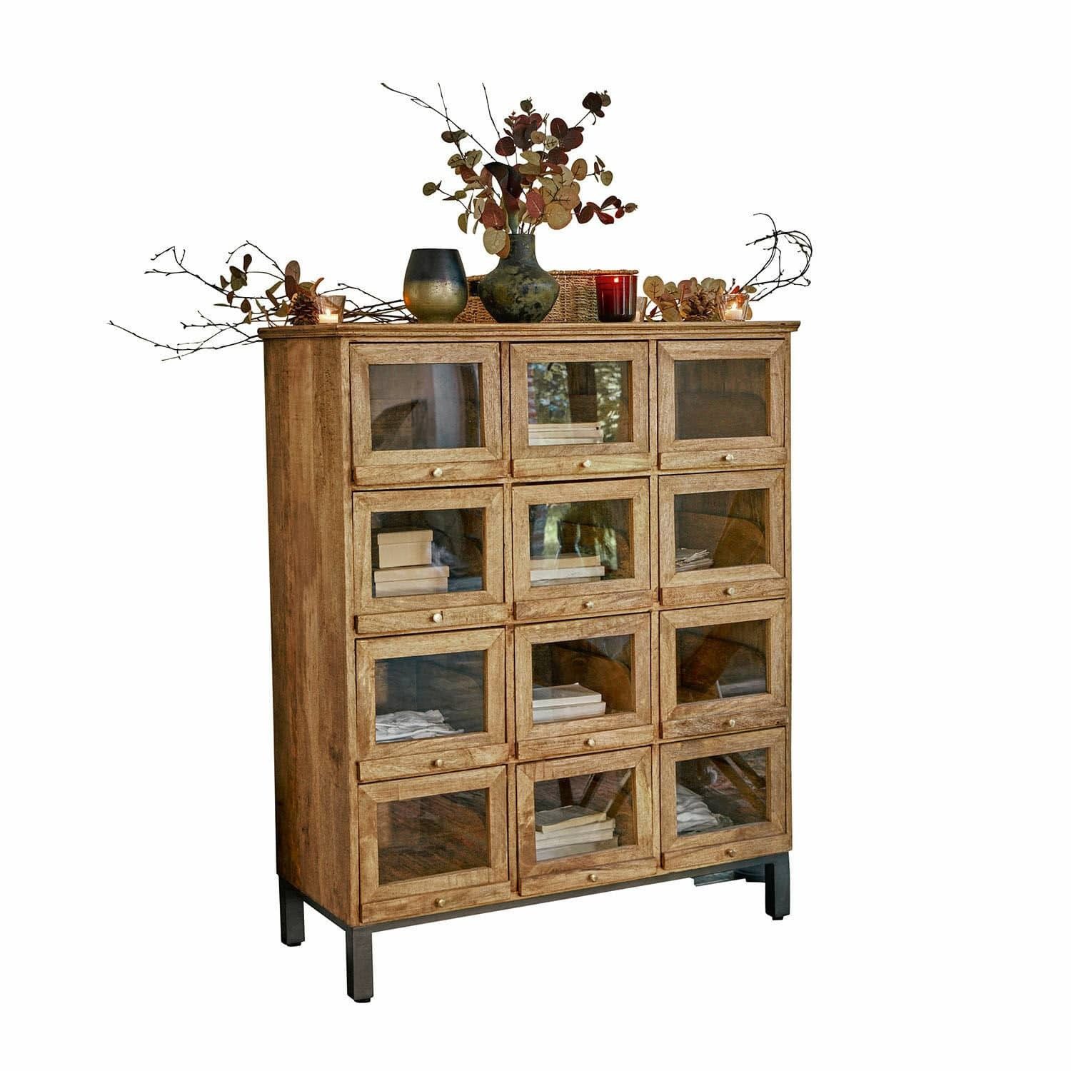 Material | Mangoholz (mangifera indica), Türeinsatz: Glas, Griff: Eisen, Füße: Eisen |