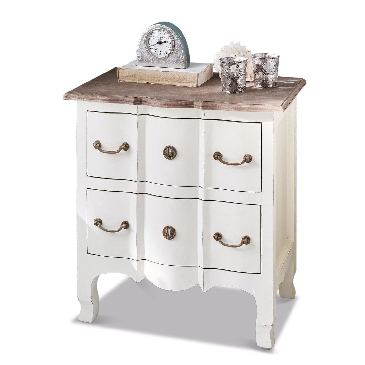 Romantisches Design im trendigen Farbkontrast aus Mangoholz. Die Schubladen sind mit je zwei nostalgischen Griffen versehen. Die naturfarbene Holzplatte schmeichelt der hellen Lackierung mit Vintage-Charme. Das zauberhafte Möbelstück aus Mangoholz begeistert mit romantischem Design und ansprechendem Farbkontrast. Die naturfarbene Holzplatte harmoniert hervorragend mit der hellen Lackierung. Diese weist eine sehr charmante Vintage-Note auf. Die verspielten Details wie die Form der Platte und die mittig applizierten Schlüssellöcher geben ihm einen besonderen Reiz.