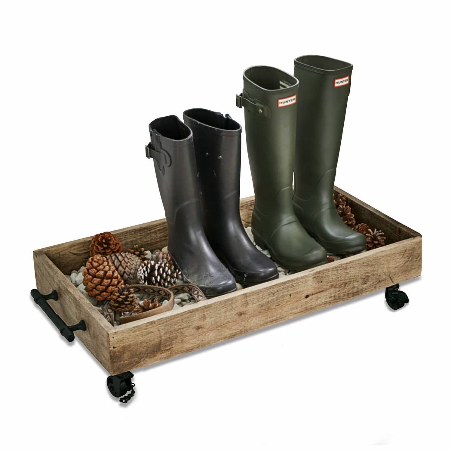Schicke Liaison aus Mangoholz und Eisen im Used-Look. Mit dem seitlichen Griff lässt sich die Ablage leicht bewegen. Rollen sind feststellbar. Ob schöne Stiefel, Schuhe fürs Büro oder Hausschuhe – in dieser stilvollen Schuhablage sind Schuhe aller Art bestens aufgehoben. Aufgrund ihrer puristischen Optik aus langlebigem Mangoholz mit schönen Maserungen und Elementen aus robustem Eisen integriert sie sich perfekt in ein Wohnambiente, das seinen Charakter durch Möbel mit klarer Linienführung und reduziertem Design gewinnt. Die Schuhwanne ist rollbar und kann festgestellt werden. So lässt sie sich bei Bedarf auch schnell mal unters Bett oder eine Sitzbank schieben. Der große Griff ist dabei in einem schönen matten Used-Look gehalten. Ein Musterbeispiel für Eleganz und Pragmatik!