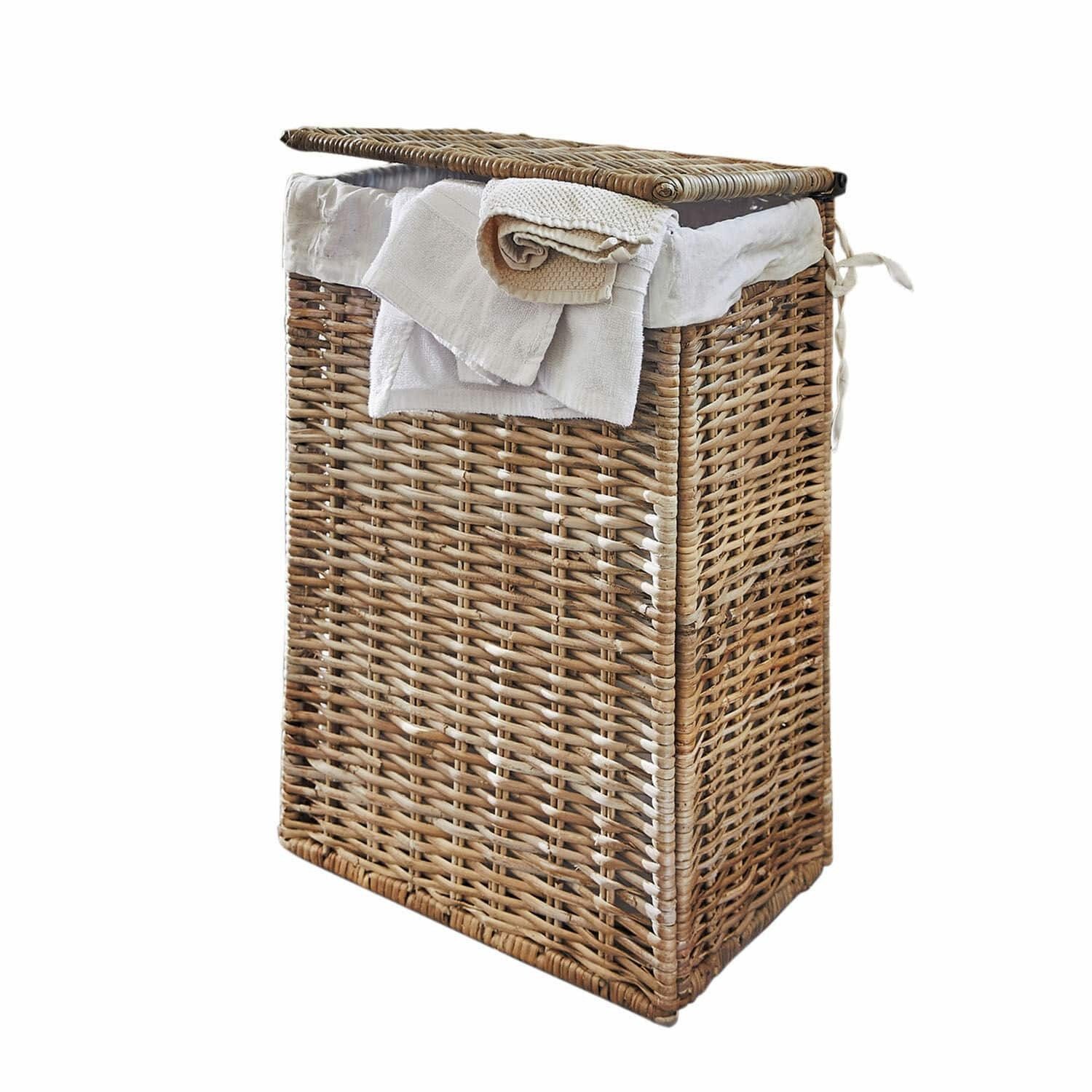 Rustikales Rattangeflecht mit Klappfunktion. Auch zur Aufbewahrung von Plaids und Kissen einsetzbar. Passend zum Landhaus-Look oder Boheme-Stil. Dieser Wäschekorb begeistert nicht nur mit seinen nützlichen Talenten. Aus handgefertigtem Rattangeflecht ist er auch äußerst dekorativ und verbreitet rustikales Flair. Der helle Baumwoll-Innenstoff ist abnehmbar und kann in der Maschine gewaschen werden. Und zwei Aussparungen an den Seiten sorgen dafür, dass sich der Korb mühelos in den Keller trägen lässt. Auch im Wohnzimmer ist er ein Blickfang und bietet Plaids und Kissen versteckten Stauraum. In ein Interieur im Landhaus-Look oder Boheme-Stil fügt sich der Haushaltshelfer besonders schön ein.