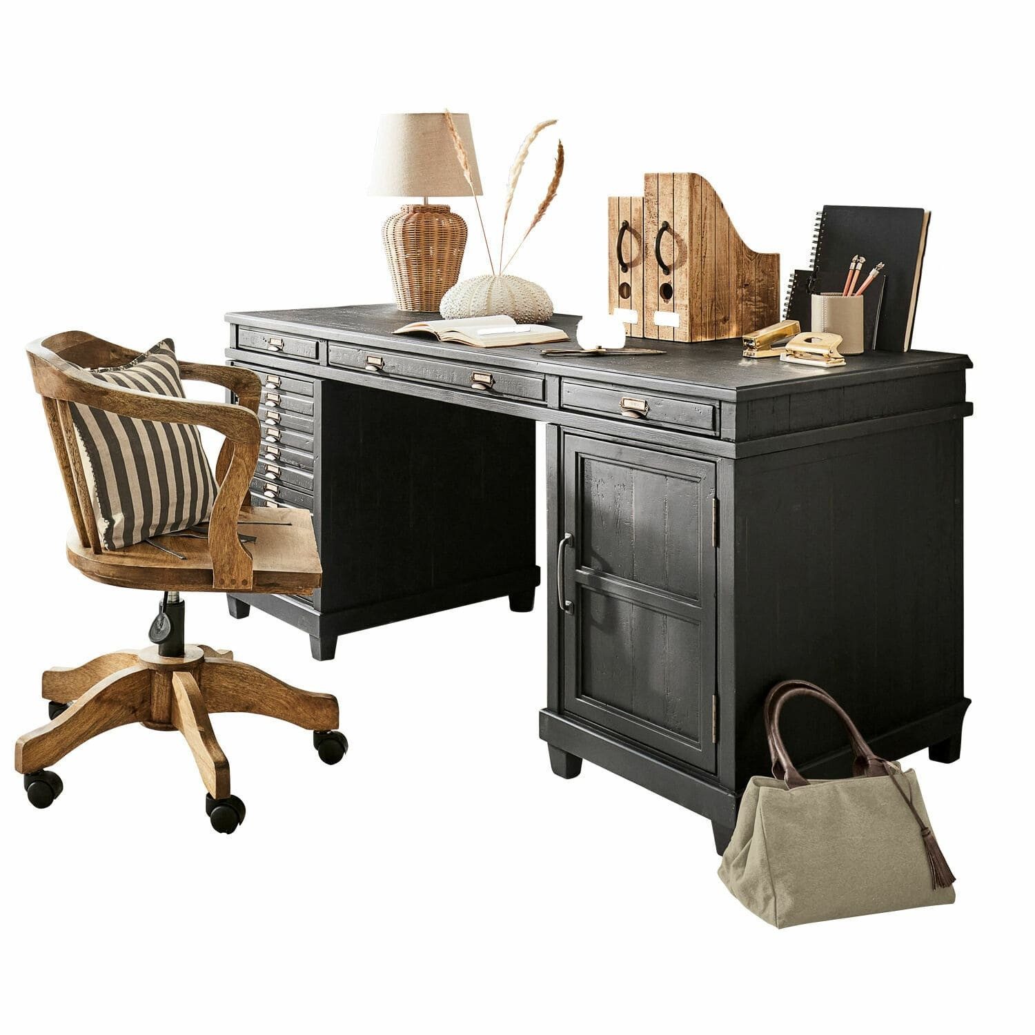Nostalgisches Schmuckstück aus wiederaufbereitetem Tannenholz. Die natürliche Maserung wird durch die dunkle Lackierung noch intensiviert. Hinter dem Dekor von schmalen Schubladen verbergen sich auf der linken Seite zwei sehr geräumig große Fächer. Dieser imposante Schreibtisch ist die perfekte Wahl für Ihr Home Office. Er ist sehr großzügig und stabil. In den hübschen Halterungen können Sie beschriftete Schildchen einstecken, sodass sie auf einem Blick sehen, was in den Fächern ist. Auf der linken Seite befinden sich zwei große Schubladen, die allerdings eine Schubladenfront besitzen, die mehr vermuten lassen. Rechts finden Sie ein großes Fach mit weiterem Stauraum. Und mittig haben Sie in drei schmalen Schubladen alles wichtige, wie Stifte etc. zur Hand. So ist Ihr Schreibtisch immer aufgeräumt. Erleben Sie ein klassisches Design fürs ganze Leben, das Ihnen lange Jahre eine Freude sein wird – so macht auch die Arbeit richtig Spaß.