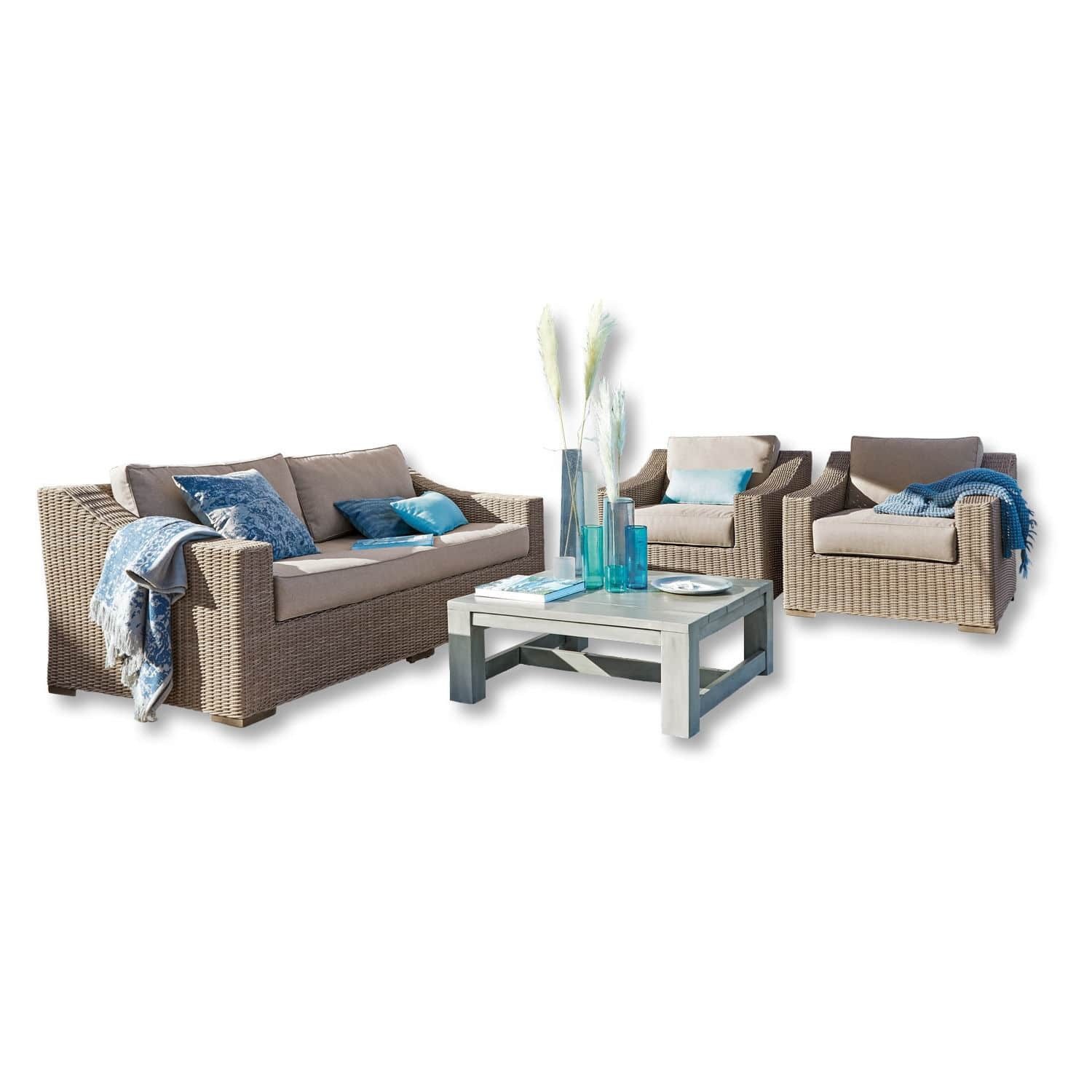 Materialzusammensetzung | Gestell: Aluminium, Geflecht: Polyrattan, Füße: Akazienholz (acacia aulacocarpa), Kissenbezug: 100% Polyester, Kissenfüllung: 100% Schaumstoff, Tisch: Akazienholz (acacia aulacocarpa) |