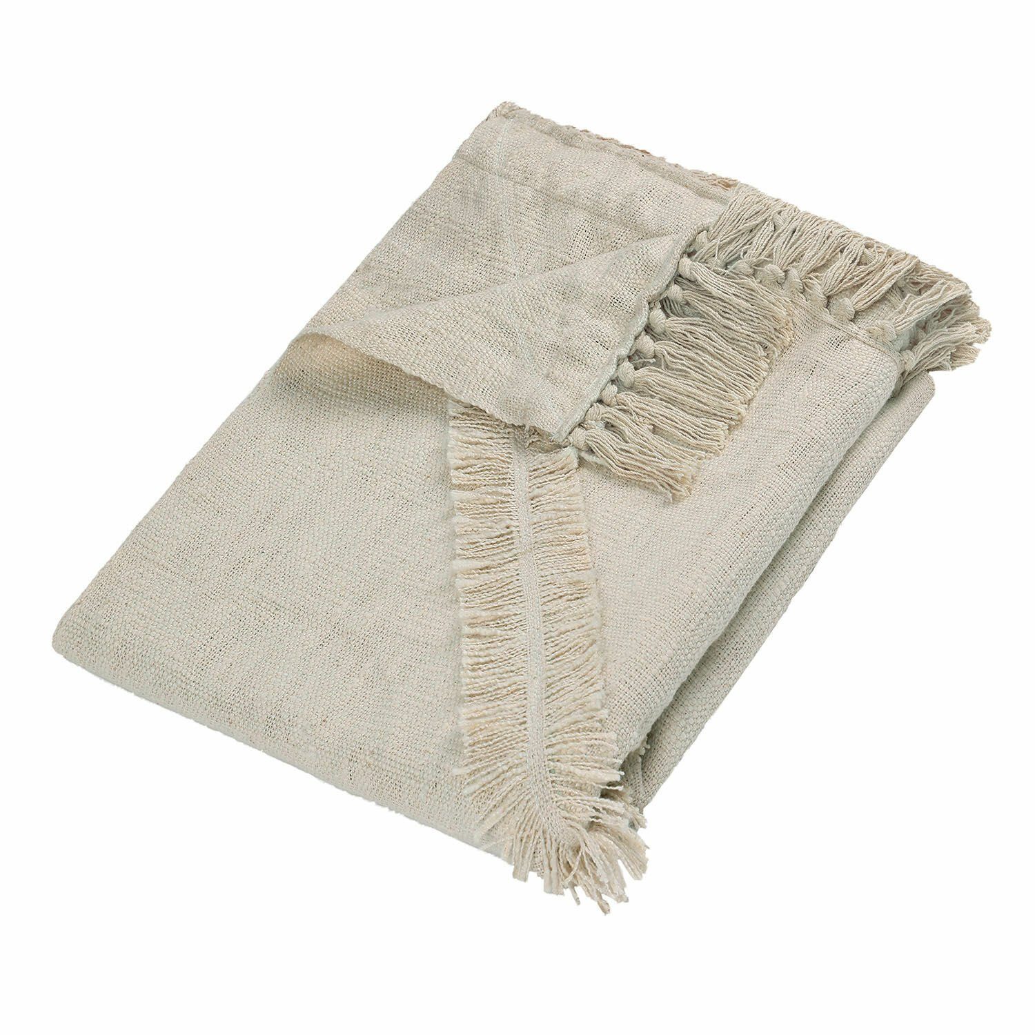 Weiche Decke mit Fransen rundum. Leichter Stoff aus reiner Baumwolle. Mit auffallend schönem Noppengarn gewebt. Im Lesesessel, auf dem Sofa oder dem Bett – kuscheln Sie sich in diesen weichen Traum, der jedes Interieur-Ambiente bereichert. Hochwertige Baumwolle und raffinierte, feine Fransen an den Enden machen das Plaid zu einer schicken Wohlfühldecke, zu der man immer gerne greift, wenn man sich eine Auszeit vom Alltag gönnen möchte.