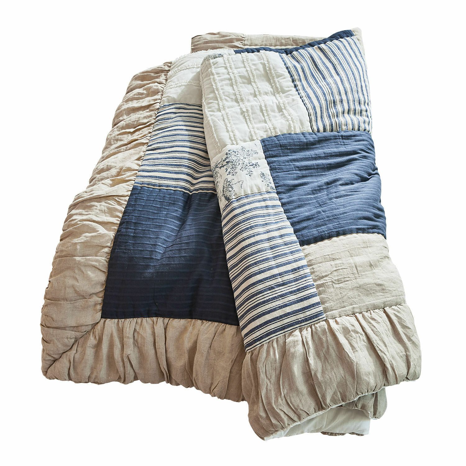 Charmantes Patchwork mit Streifen- und Toile-de-Jouy-Musterung. Weich wattiert für gemütliche Stunden und kühle Nächte. Mit breitem, verspieltem Volantabschluss. Dieser Quilt verbindet rustikale Behaglichkeit mit textilem Feingefühl. Unterschiedliche Muster – von klassischen Streifen über feines Toile-de-Jouy bis zu naturfarbenem Leinen-Look – fügen sich zu einem harmonischen Gesamtbild. Die leichte Wattierung sorgt für wohlige Wärme, während der breite Rüschensaum dem Design eine verspielte Note verleiht. Ideal für entspannte Abende oder als dekoratives Highlight auf dem Bett.