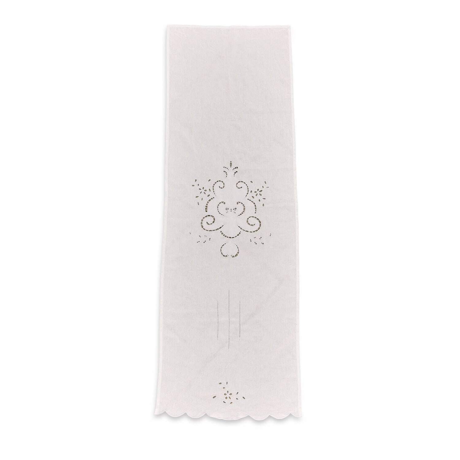 Aus natürlichem Leinen sehr fein gewebt. Mit kunstvoll ausgearbeiteten Lochstickereien . Hübsche Wellenkante an einem Ende. Nostalgische Romantik aus einem besonders feinen Leinengewebe. Die kunstvoll gearbeiteten Lochstickereien in floralem Muster sind charakteristisch für das Design und versprühen einen unwiderstehlichen Charme. Dazu gehört auch die hübsche, einseitige Wellenkante, die den Läufer gelungen abrundet. So viel Stil und Liebe zum Detail zieht alle Blicke auf sich – auf dem Esstisch, auf der Kommode oder auf dem Sideboard. Ein edles Wohntextil, das sich mit fast allen Stilrichtungen verträgt.