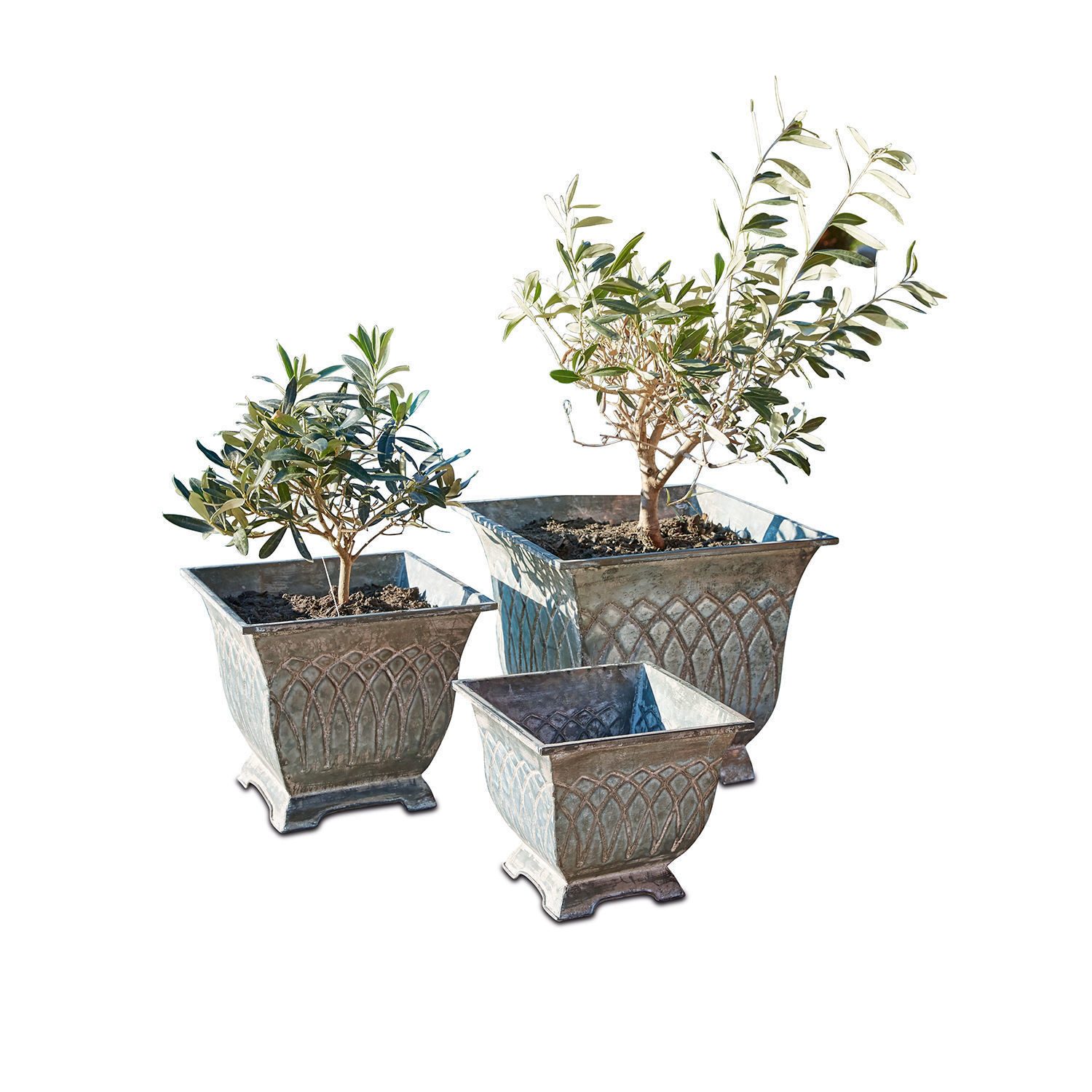 Drei verschiedene Größen im Set. Französisches Vintage-Design mit charmantem Muster. Aus Eisen mit schöner Antik-Patina. Dieses hochdekorative, von antiken Originalen aus Frankreich inspirierte Set, umfasst drei wunderschöne Übertöpfe für den Innen- oder Außenbereich. Die unterschiedlich großen Pflanzgefäße sind aus Eisen geformt und somit deutlich leichter als ähnliche Produkte aus Steingut. Sie sind auch widerstandsfähiger und zerbrechen nicht, wenn sie umgeworfen oder von spielenden Kindern touchiert werden. Ein weiterer Pluspunkt ist die wunderschöne Patina, die den authentischen Antikstil unterstreicht. Im Laufe der Jahre wird die Oberfläche immer schöner. An diesem Set können Sie sich wirklich ein ganzes Leben lang erfreuen.