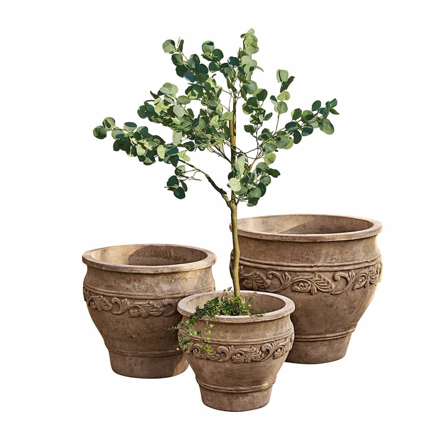 Handgefertigte Unikate mit Antik-Charakter. Sehr hochwertig gearbeitet, mit aufwendigem Dekor. Wasserfestes Set in drei Größen. Blühende Sträucher locken die Blicke, uralte Oliven prägen ganze Landschaften, prachtvolle Bougainvillea klettern an imposanten Natursteinmauern in die Höhe und über allem schwebt der verführerische Duft von Zitronenblüten und Lavendel – auch Sie sind dem Charme der sonnenverwöhnten Gärten rund ums Mittelmeer verfallen? Dann werden Sie sich auch in Ihrer grünen Oase mit vielen mediterranen Pflanzenschätzen umgeben wollen. Und damit sich diese ganz stilvoll in Szene setzen können, haben wir dieses Übertopf 3er Set kreiert. Jeder Übertopf wurde ganz traditionell von Hand aus Ton gefertigt und mit einem klassischen Palmwedel-Dekor verziert, der besonders schön mit dem antikbeigen Farbton harmoniert und wirkt, als wären die Töpfe viele Jahre intensiver Sonne ausgesetzt gewesen. Jeder Übertopf ist UV- und wasserfest und hat ein kleines Bodenloch.