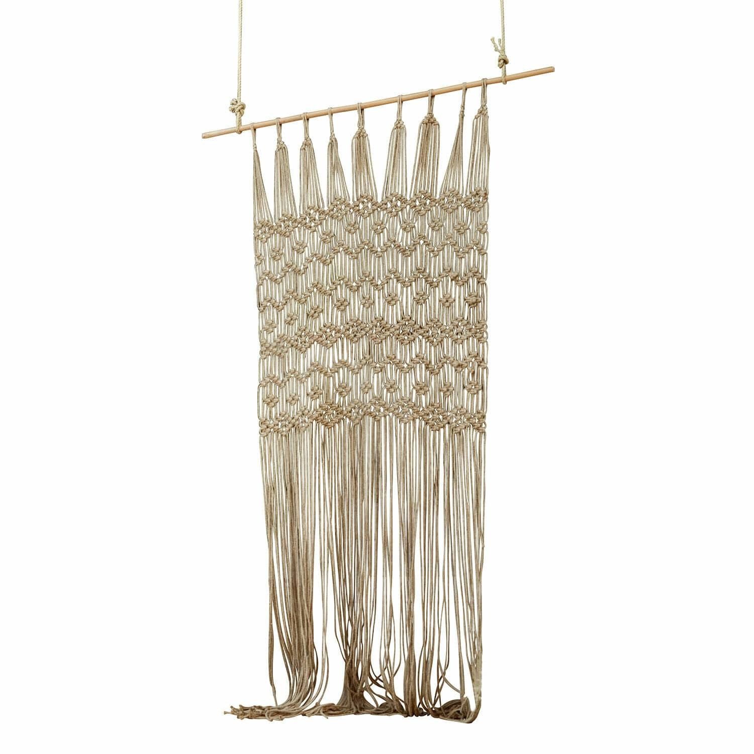 Aufwendig handgeknüpftes Makramee-Kunstwerk. Aus der Naturfaser Jute. Dank praktischer Ösen einfach aufzuhängen. Seit einigen Jahren mischt der stylische Bohemian-Look auch moderne Wohn-Interieurs auf und ergänzt gekonnt den unkonventionellen Wohnstil passionierter Individualisten. Diese Gardine ist im wahrsten Sinne des Wortes ein Musterbeispiel für Accessoires im Boho-Style, wurde sie doch in klassischer Makramee-Technik aus der Naturfaser Jute aufwendig von Hand geknüpft. Diese ursprünglich aus dem Orient stammende Knüpftechnik zeigt eine wunderschön lebendige Optik, ohne der Gardine ihre übliche Funktion zu nehmen, nämlich Licht hindurchzulassen, aber neugierige Blicke abzuhalten. Eine Gardine im Makramee-Look zeichnet sich auch durch eine besondere Vielseitigkeit aus: Im Indoor-Bereich verleiht sie Wohnräumen das gewisse Etwas, sie kann aber auch an der Terrassen- oder Balkontür aufgehängt werden, sodass die Tür offenstehen kann und trotzdem lästige Fliegen und unterwünschte Blicke abgehalten werden. Und dank der praktischen Ösen ist die Gardine im Nu aufgehängt.