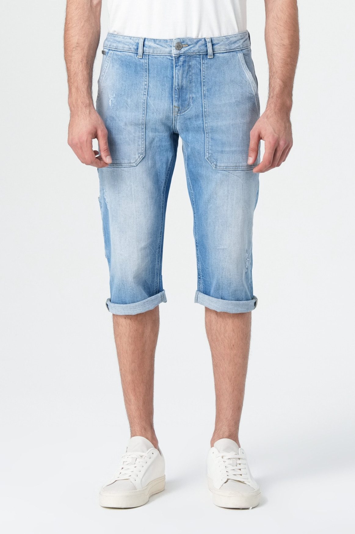 Tim Herren Bermuda Shorts Comfort Fit Deeply Blau – Blaue Premium-Bermudas mit praktischer TaschenlösungDie Tim Comfort 3/4 Bermuda Shorts in Deeply Blue überzeugen durch ihre perfekte Kombination aus Funktionalität und lässigem Style. Der Comfort Fit sorgt für angenehme Bewegungsfreiheit, während die hochwertige Materialzusammensetzung aus 99% Baumwolle und 1% Elastan für langanhaltenden Tragekomfort und eine optimale Passform sorgt. Die helle Waschung in Deeply Blue zeichnet sich durch leichte Used-Effekte aus, die dem Look eine authentische Note verleihen. Besonders charakteristisch sind die praktischen Aufnähtaschen an der Front, die nicht nur als stylisches Detail dienen, sondern auch zusätzlichen Stauraum bieten.Versatile Jeans-Shorts mit smarten ElementenDie umgeschlagenen Beinabschlüsse verleihen der Tim Bermuda einen lässigen Touch und die Möglichkeit, die Длина individuell anzupassen. Auf der Rückseite beeindrucken die klassischen Gesäßtaschen mit sauberer Verarbeitung, während ein dezentes Markenlabel den hochwertigen Look abrundet. An der Seite sorgt eine zusätzliche Cargo-Tasche für praktischen Stauraum und ein modisches Detail. Die leichte, sommerliche Jeans-Qualität mit zartem Stretch-Anteil garantiert ein angenehmes Tragegefühl selbst an heißen Tagen. Kombiniere diese vielseitige Shorts mit weißen Sneakern und einem schlichten T-Shirt für einen perfekten Sommer-Look, der sowohl für Stadtbummel als auch für entspannte Freizeitaktivitäten geeignet ist. Die Tim Comfort 3/4 ist ein zuverlässiger Begleiter durch die warme Jahreszeit.
