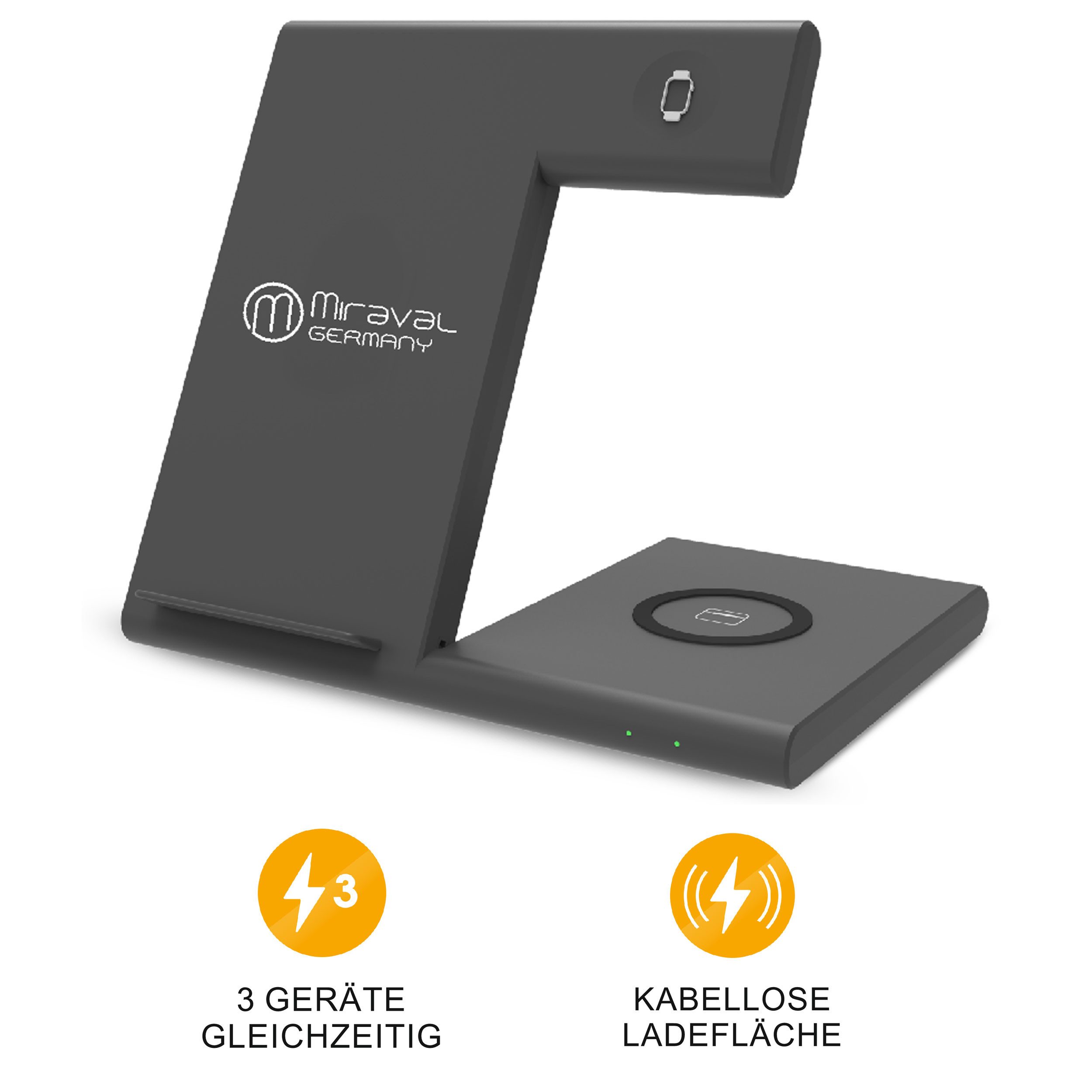 Die 3-in-1 Ladestation von Miraval ist die kompakte Lösung für das kabellose Aufladen von Smartphone, Kopfhörern und Smartwatch. Durch das klappbare Design lässt sich die Station platzsparend verstauen – ideal für unterwegs oder auf dem Schreibtisch. Eine grüne LED-Leuchte zeigt den aktiven Ladevorgang an. Dank USB-C-Anschluss und mitgeliefertem Kabel ist das Gerät sofort einsatzbereit.