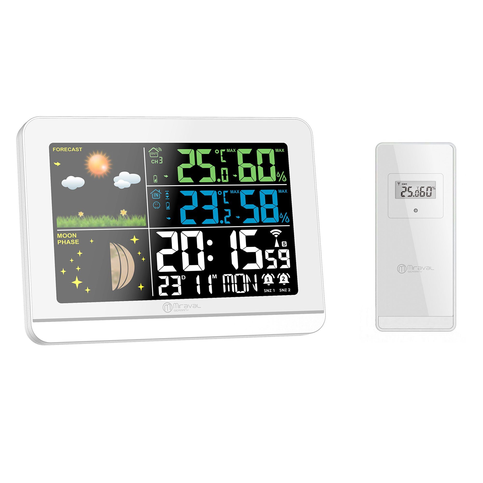 Die moderne Miraval Funk-Wetterstation ist nicht nur ein stilvoller, sondern auch ein funktioneller Begleiter für jeden Haushalt. Dank ihres eleganten Designs in Weiß und dem robusten Gehäuse aus Kunststoff fügt sie sich nahtlos in jede Wohnumgebung ein. Ein besonderer Hingucker ist das beleuchtete Farbdisplay, das nicht nur durch seine leuchtenden Farben besticht, sondern auch durch seine klare und übersichtliche Anzeige.